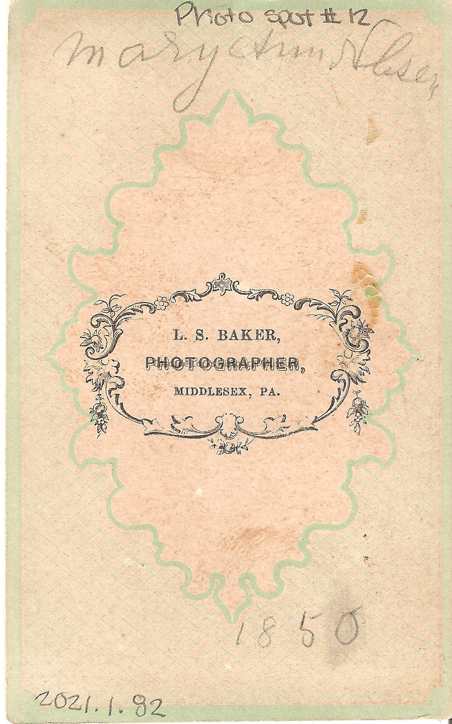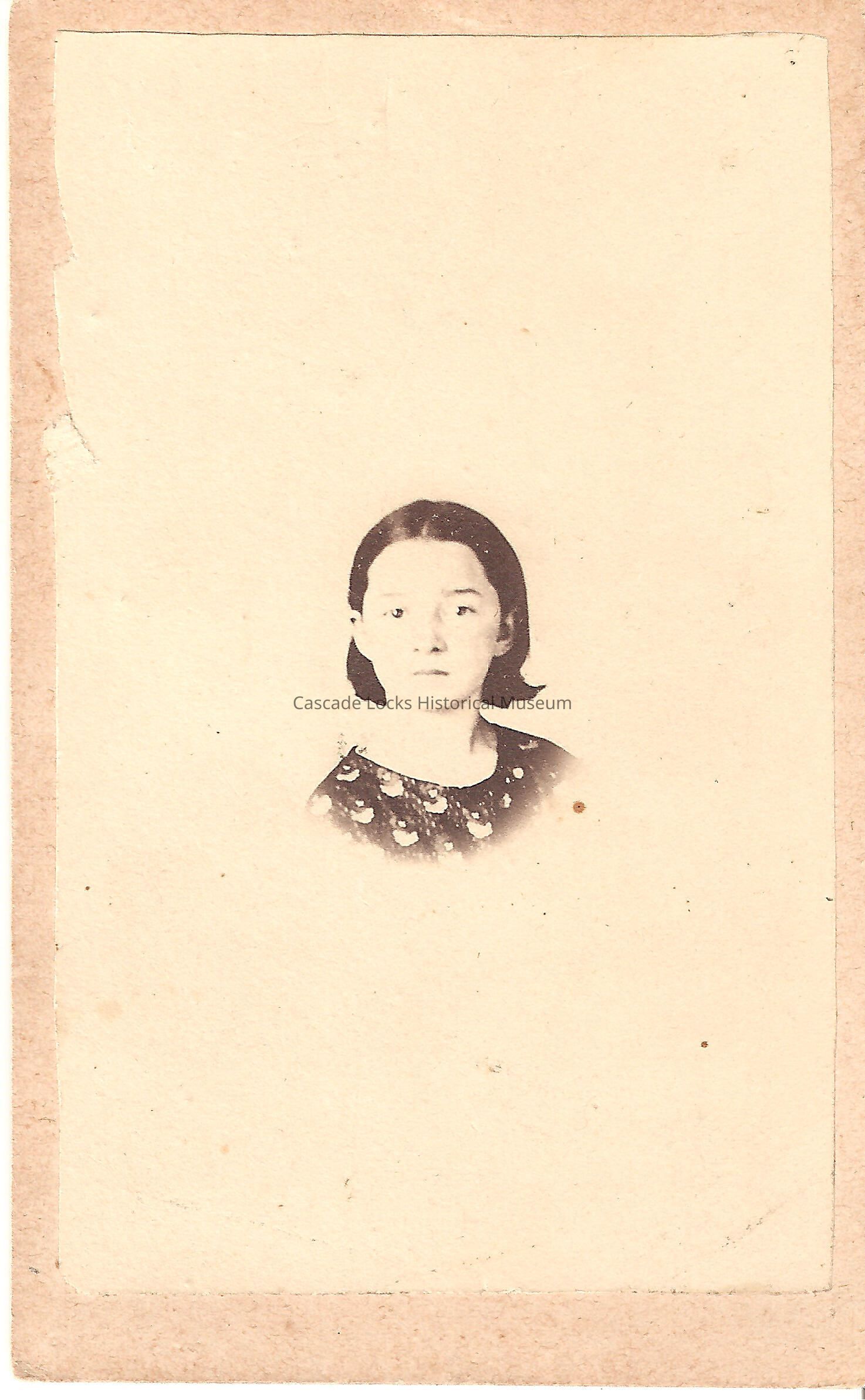 Photo portrait of Maryann Nelson. The image is in black and white of a young girl with dark shoulder length hair. Photo is on a tan cabinet card with green detailing on back. Back of card reads: Maryann Nelson. L. S. baker, Photographer, Middlesex, Pa. Previously located in photo album 71.74.4 in spot number 13 donated by Margret Johnson
