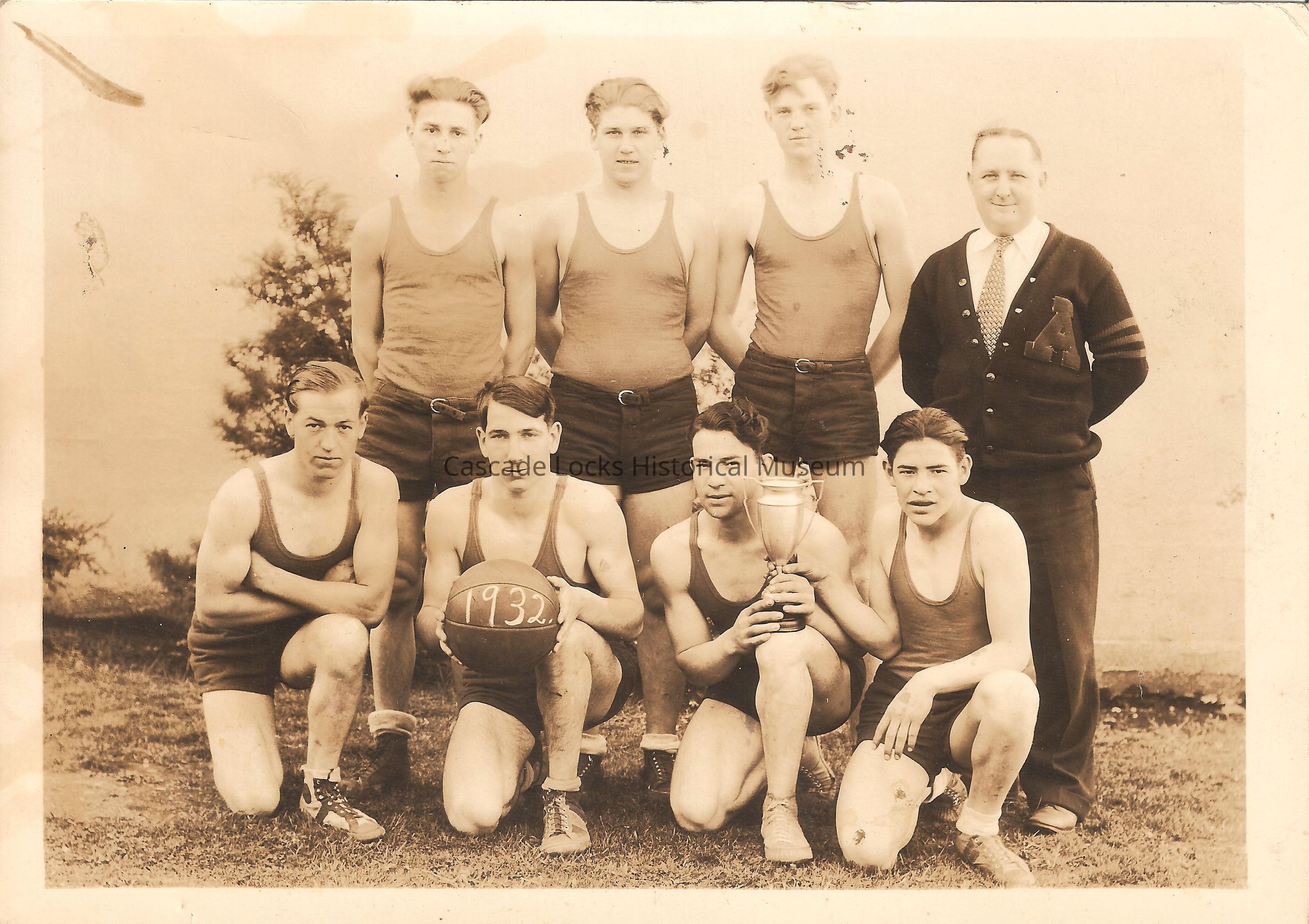 Photograph of a school men's basketball team. The team is made up of seven players and 1 couch. The players are in short shorts and tank tops, while the coach is in a letterman sweater with a patch (A) on the chest and tie. The middle player in the front row is holding a basketball with 33/34 written on it.