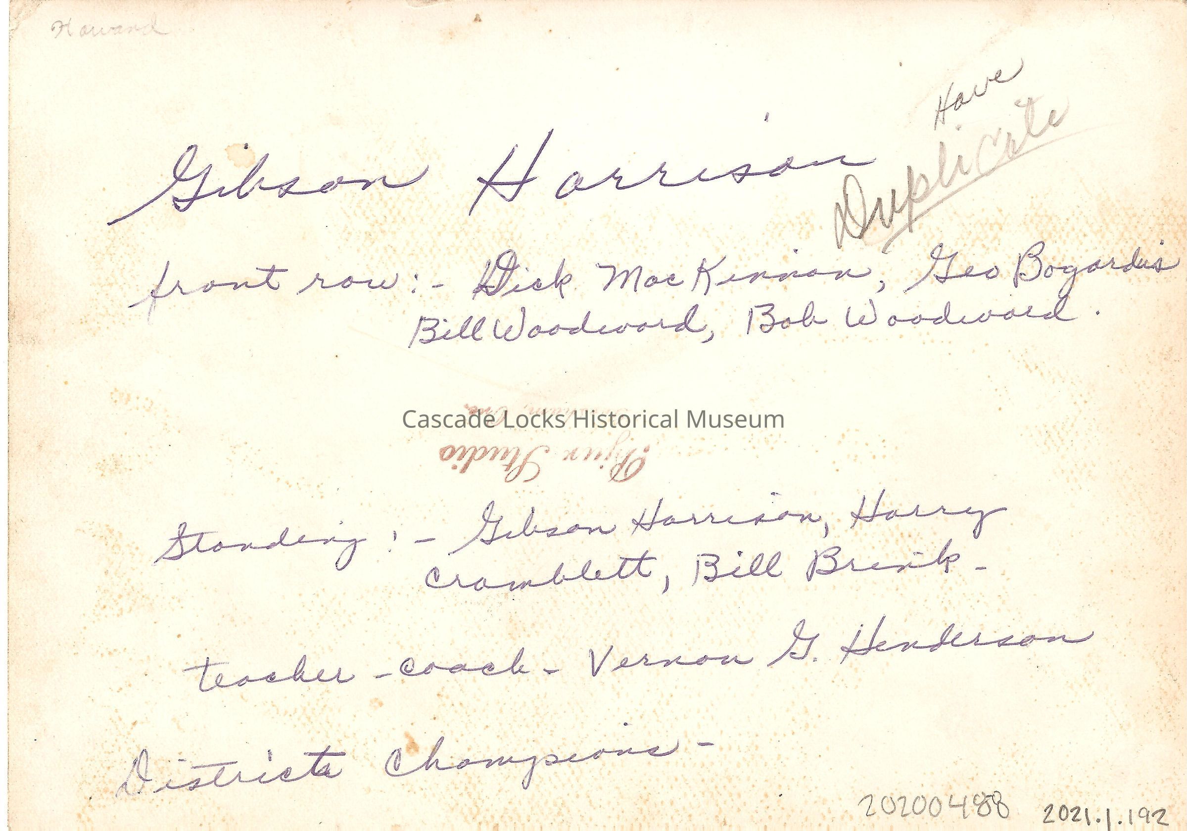 Back of card reads; Dick Mickinnon, George Bogordus, Bill Woodward, Bob Woodward, Gibson Harrison, Harry Cramblett, Bill Brink, Vernon Henderson Coach. District Champions. Bjur Studio, Gresham, Ore.Language