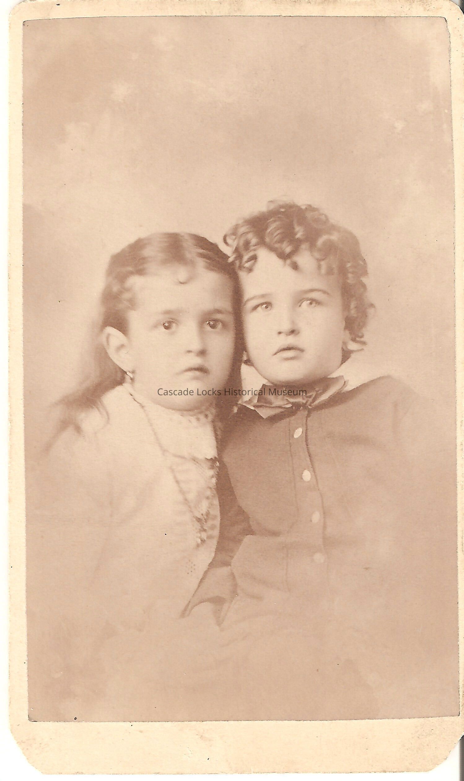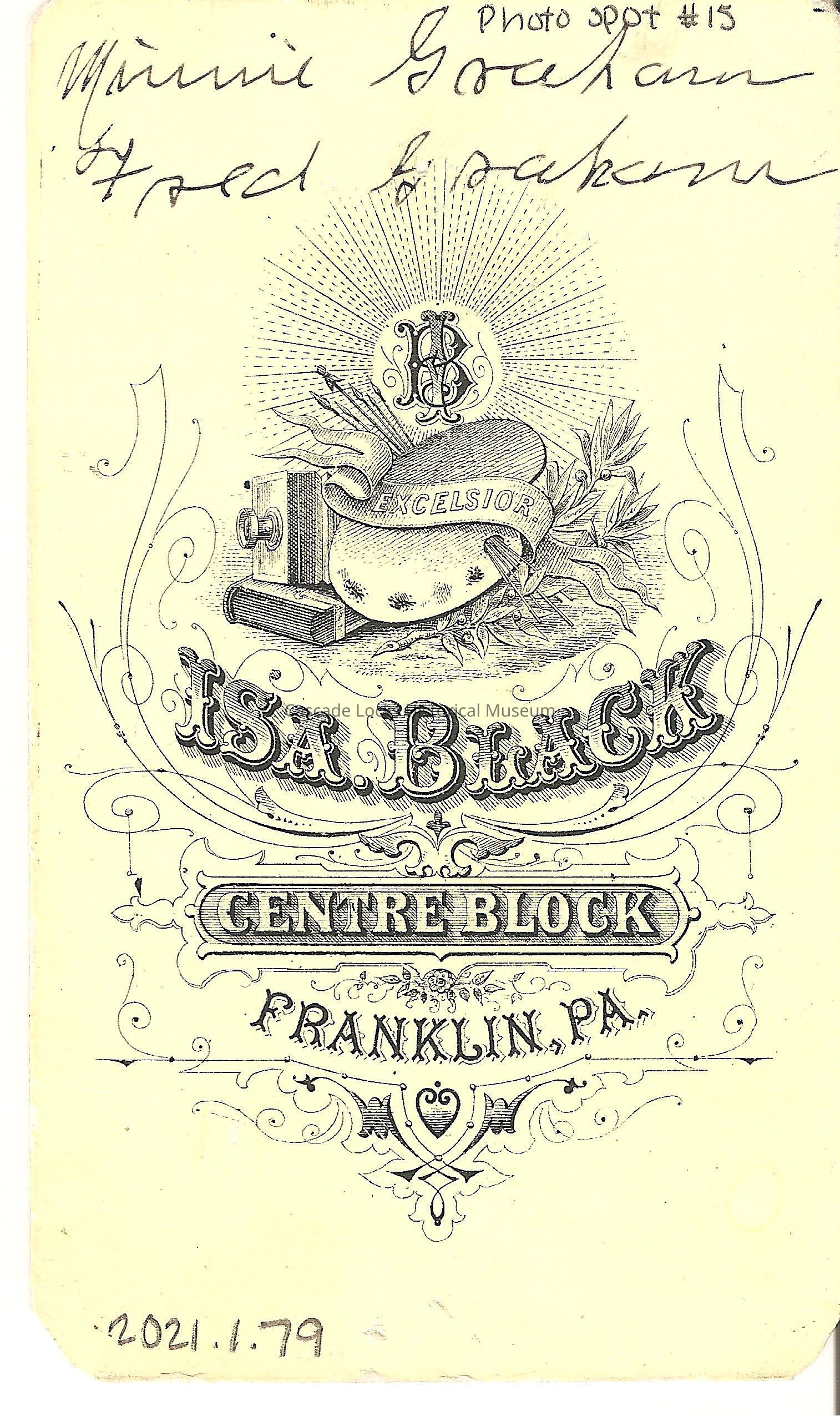 Photo portrait of two individuals, Minnie Graham and Fred Graham. The image is in black and white of two children, a boy and a girl. The girl is in a white outfit with lose hair, and the boy is wearing a dark button up coat with a bowtie. Image is on an off-white cabinet card. Back of card reads: Minnie Graham, Fred Graham. Excelsior. ISA Black, Centre Block, Franklin, Pa. Previously located in photo album 71.74.4 in spot number 15 donated by Margret Johnson