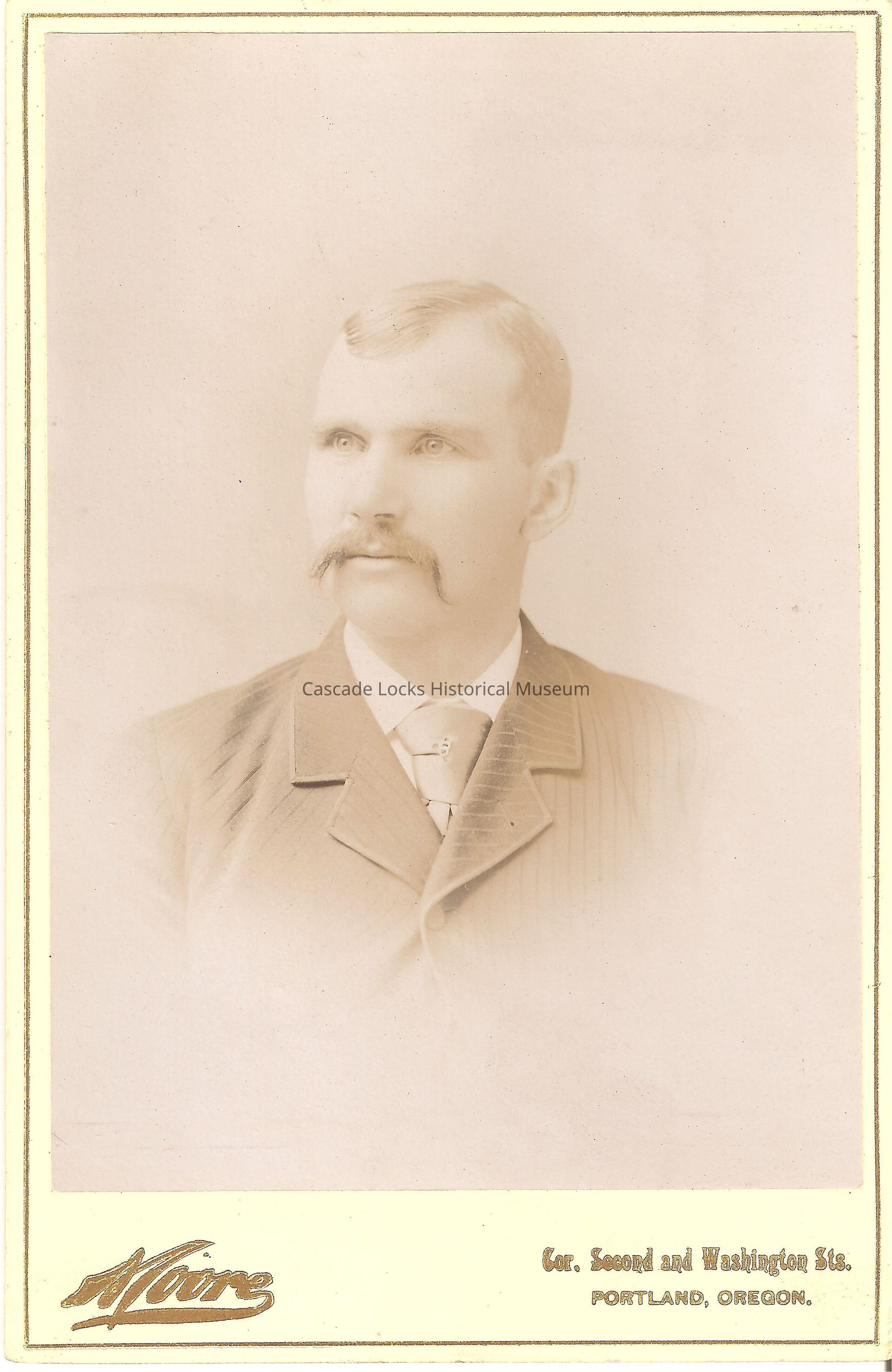 Photo portrait of a man with light hair and mustache, light eyes wearing a suit jacket and tie. Image is in black and white. Image is on white cabinet card with gold font. Card reads: Moore. Cor. Second and Washington Sts. Portland, Oregon. Back of card reads: Duplicate copies of this negative or from old negatives made by Abell & Son, will be supplied at any time at greatly reduced rates. Life-Sized bromide portraits $10.00, crayon and oil portrait work a specialty. E. W. Moore, Artist. Successor to Abell & Son. Previously located in photo album 2020.1.19 photo slot 48.