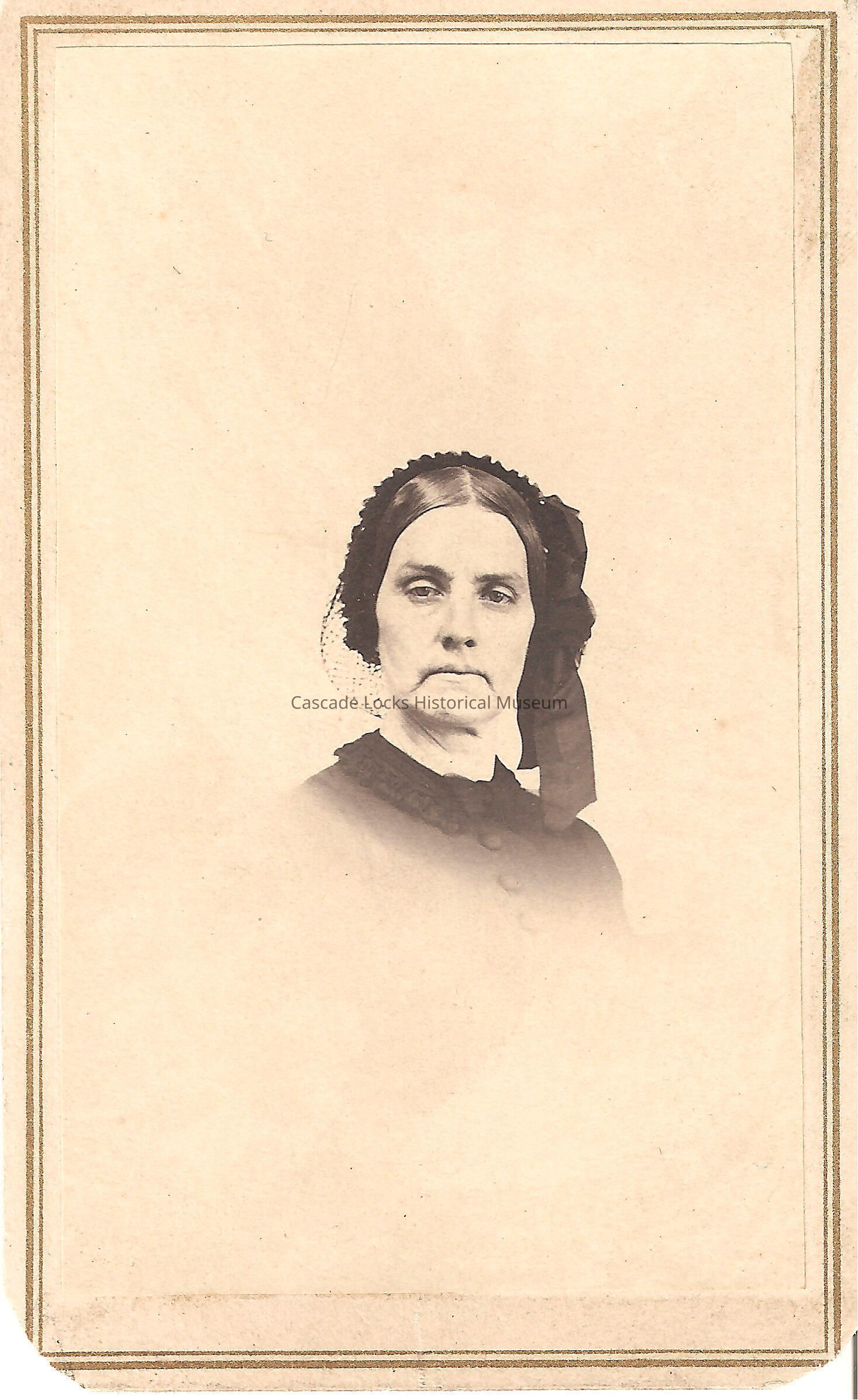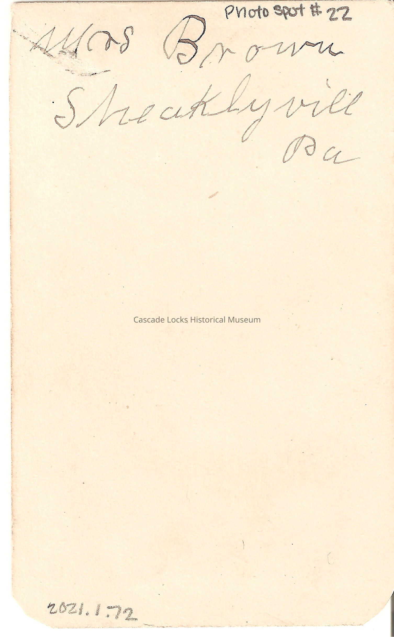 Photo portrait of Mrs. Brown. Image is of a woman with dark hair and a hat on wearing a high neck jacket with large frontal buttons. Image is on a white cabinet card with a gold boarder. Back reads: Mrs. Brown Sheaklyville, Pa. Previously located in photo album 71.74.4 in spot number 22 donated by Margret Johnson.