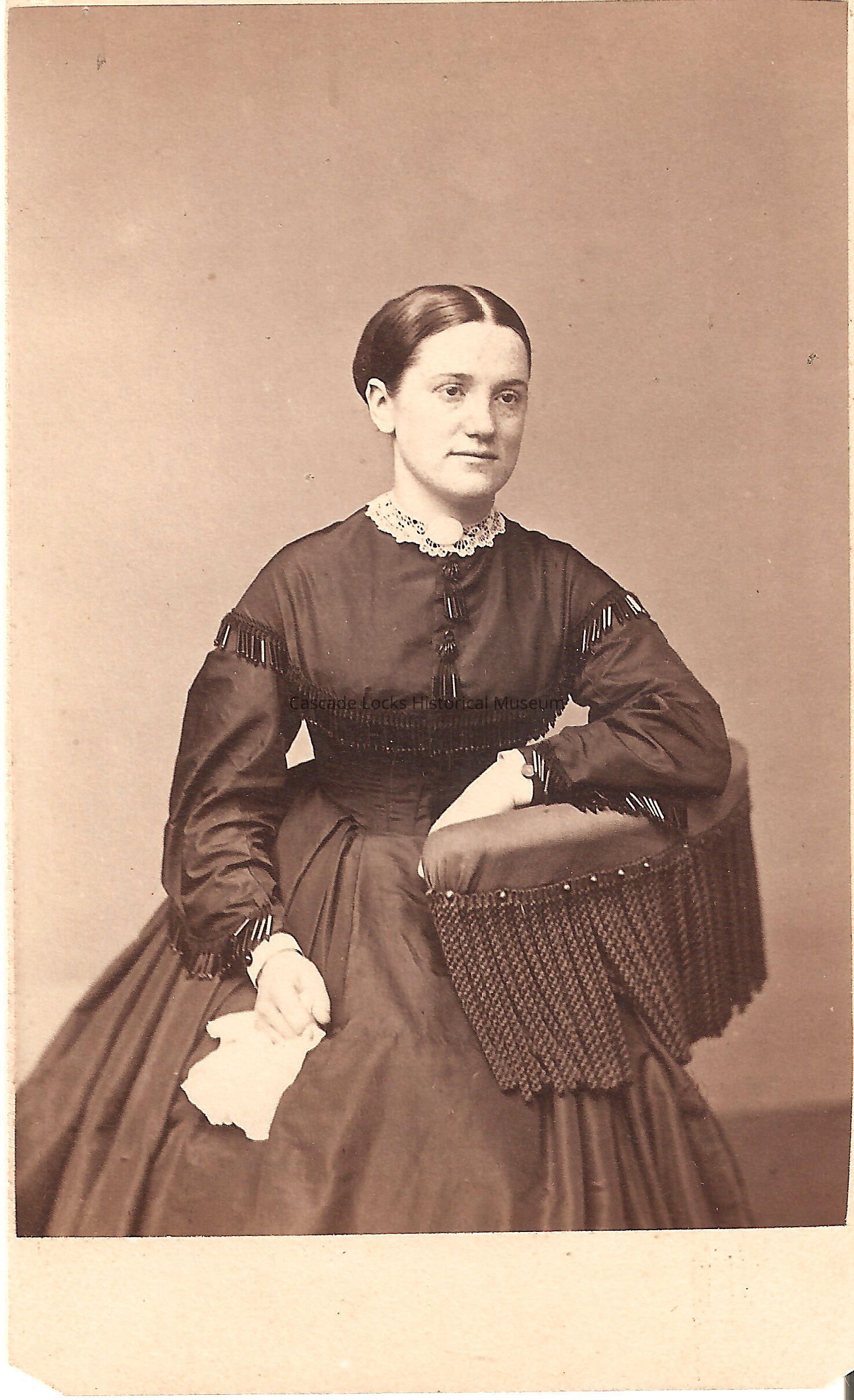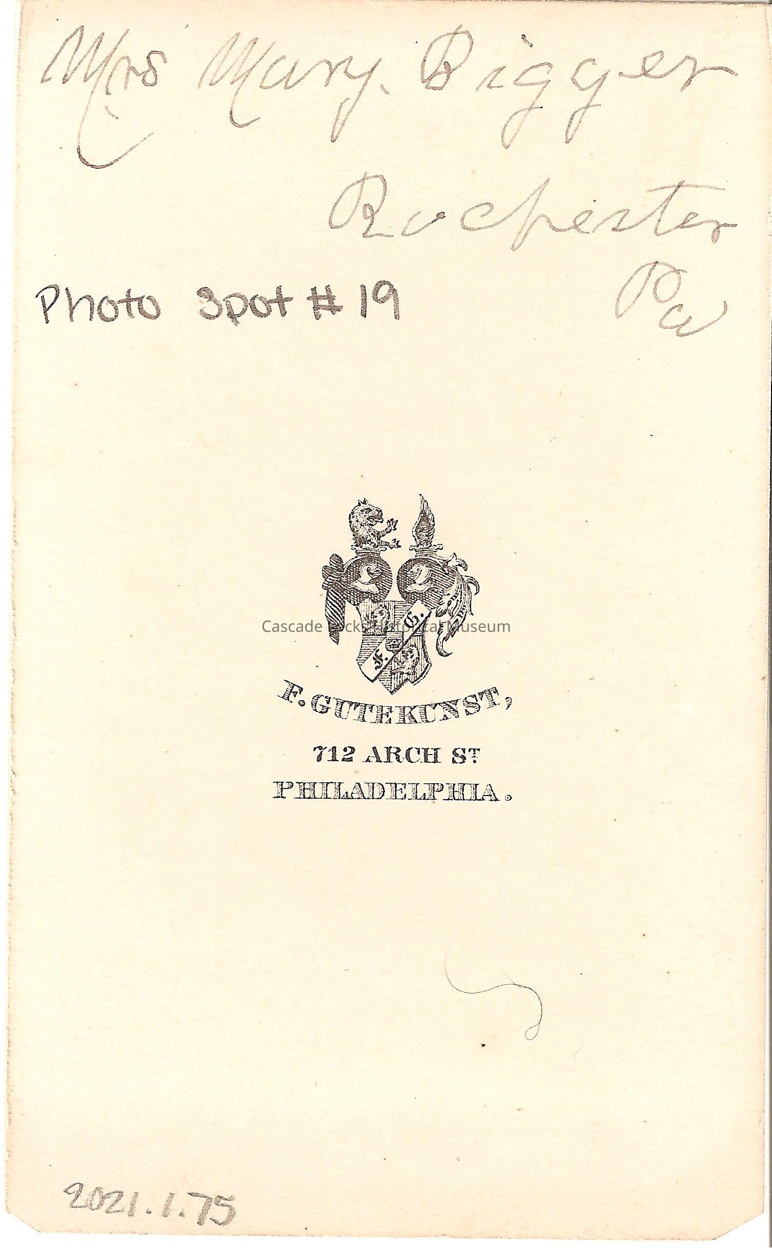 Photo portrait of Mrs. Mary Bigger, Rochester, Pa. Image is in black and white of a women with dark hair wearing a dark dress with beaded fringe along the upper sleeve and bust, short collar, and round neck pin. Image is on white cabinet card. Back of card reads: Mrs. Mary Bigger, Rochester, Pa. F. Gutekunst, 712 Arch St. Philadelphia. Previously located in photo album 71.74.4 in spot number 29 donated by Margret Johnson.