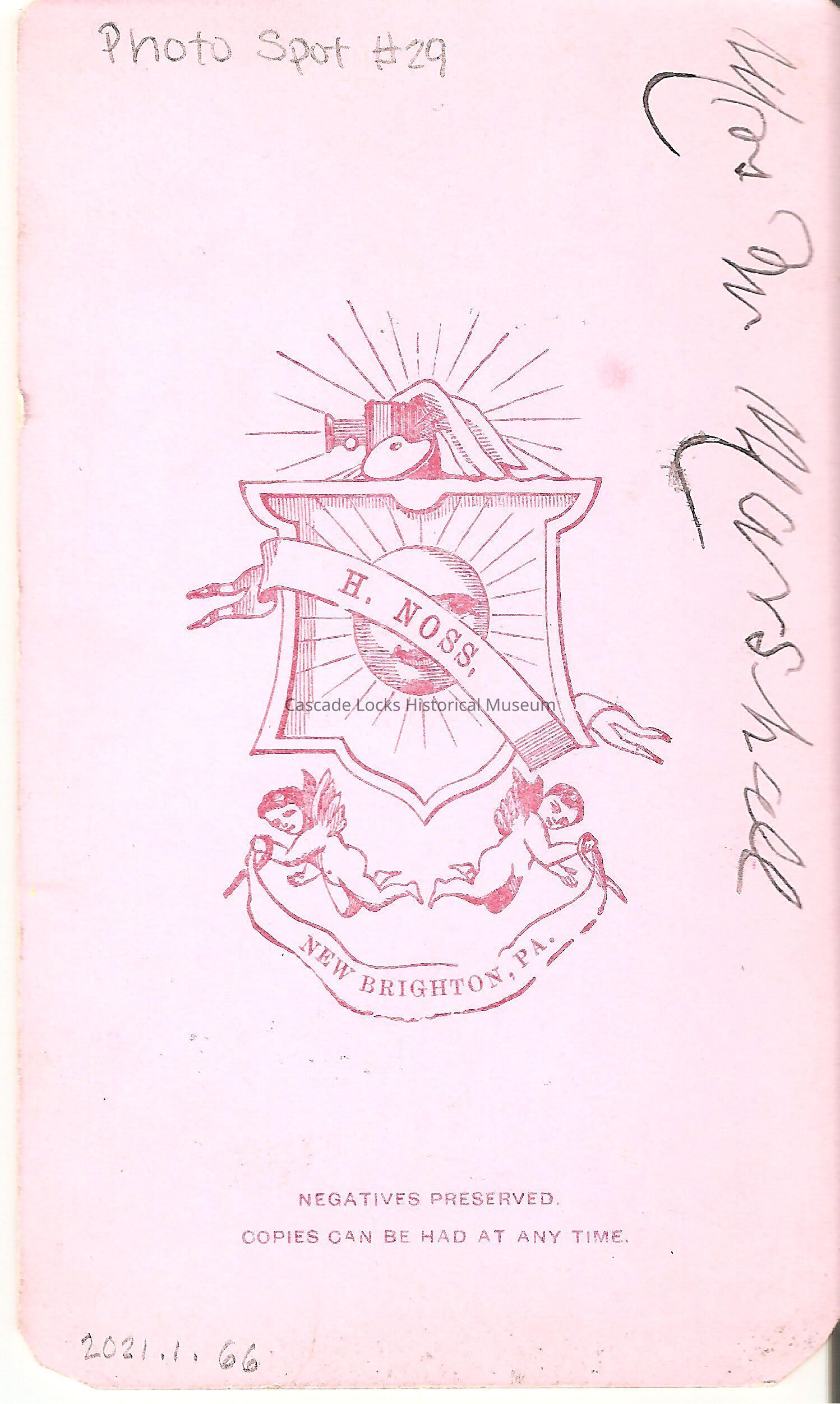 Photo portrait of Mrs. W. Marshall. Image is in black and white of a woman with dark hair bound in netting wearing a dark jacket with light colored collar. Image is on white cabinet card, back of card has a pink hue discoloration. Back of card reads: Mrs. W. Marshall (written in ink). H. Noss, new Brighton, Pa. Negatives Persevered. Copies can be had at any time. Previously located in photo album 71.74.4 in spot number 29 donated by Margret Johnson.