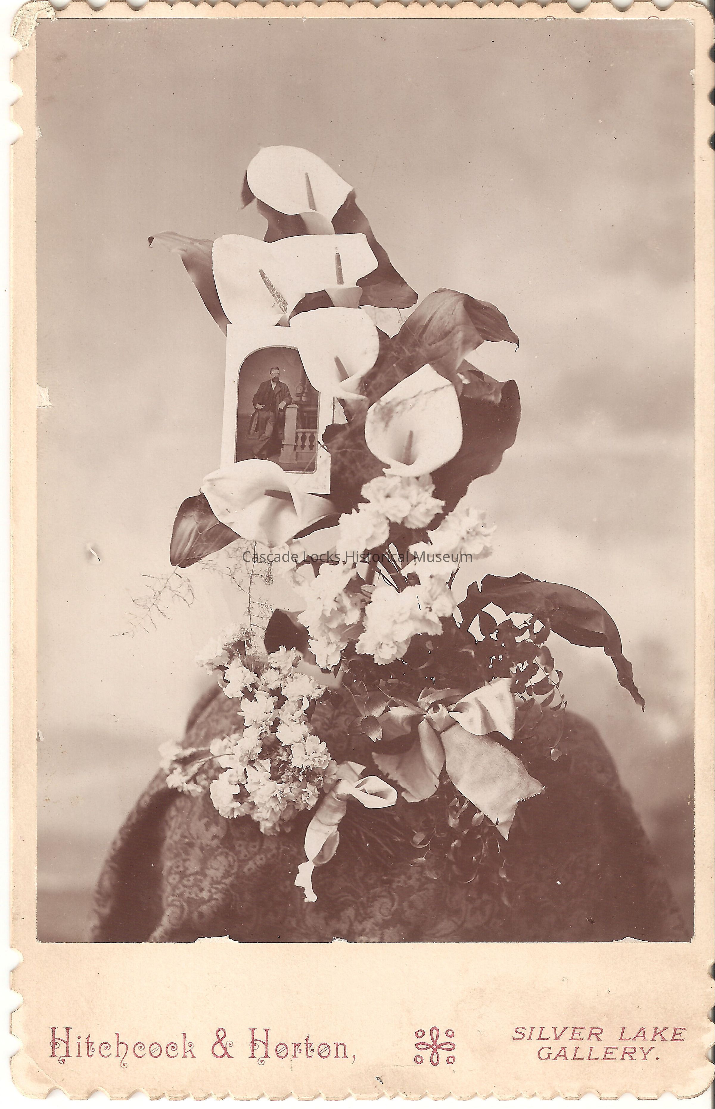 Photo of a Peace Lilly floral arrangement with a photograph in the floral arrangement of an older man with dark hair and goatee wearing a suit with open jacket. Image is in black and white. Image is on off-white cabinet card. Card reads: Hitchcock & Horton, Silver Lake Gallery. Previously located in photo album 2020.1.17.