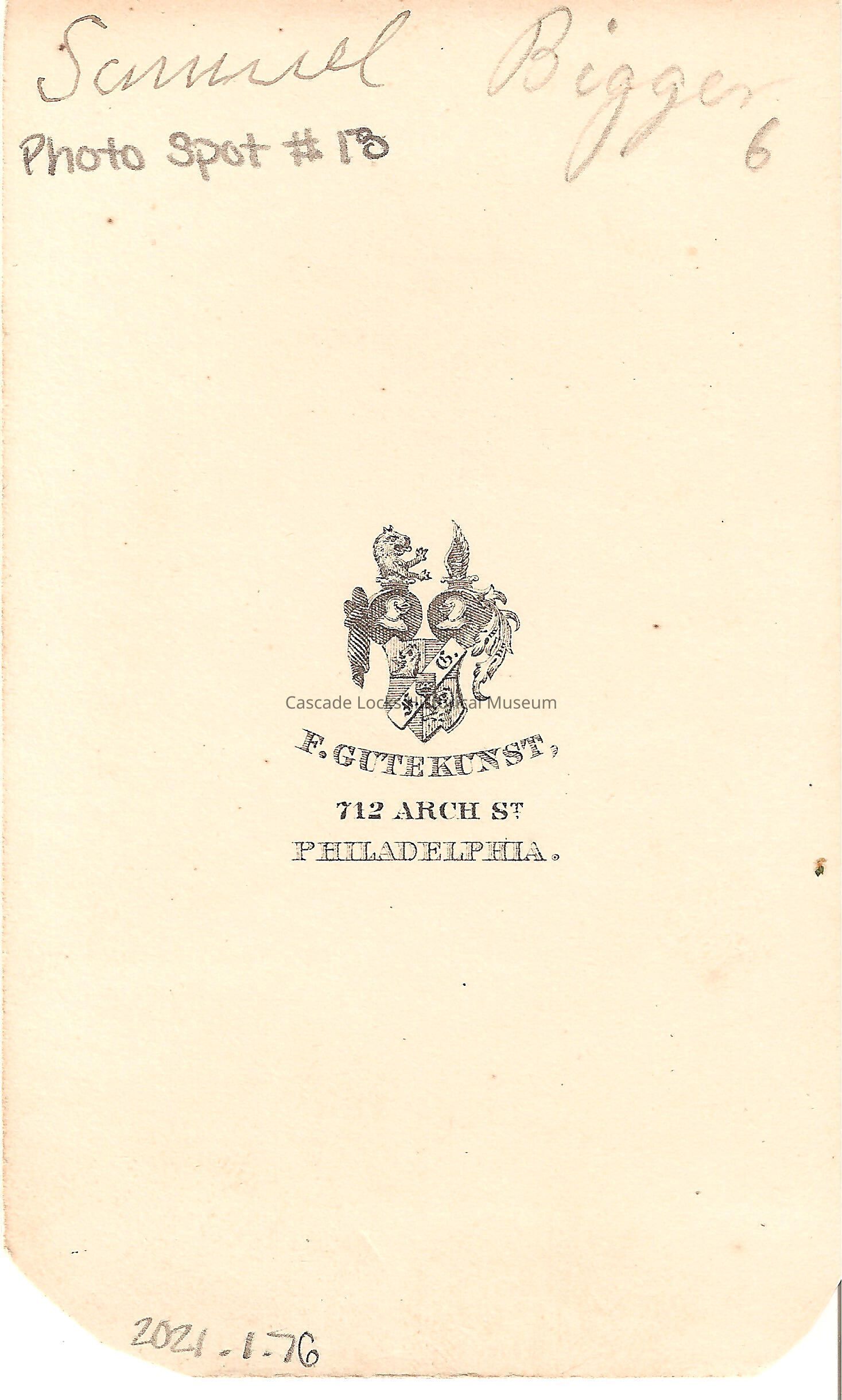 Photo portrait of Mr. Samuel Bigger. Image is in black and white of a man with light hair, light colored eyes wearing an overcoat, vest and button up shirt with a bowtie. Image is on white cabinet card. Back of card reads: Mr. Samuel Bigger. F. Gutekunst, 712 Arch St. Philadelphia. Previously located in photo album 71.74.4 in spot number 18 donated by Margret Johnson.