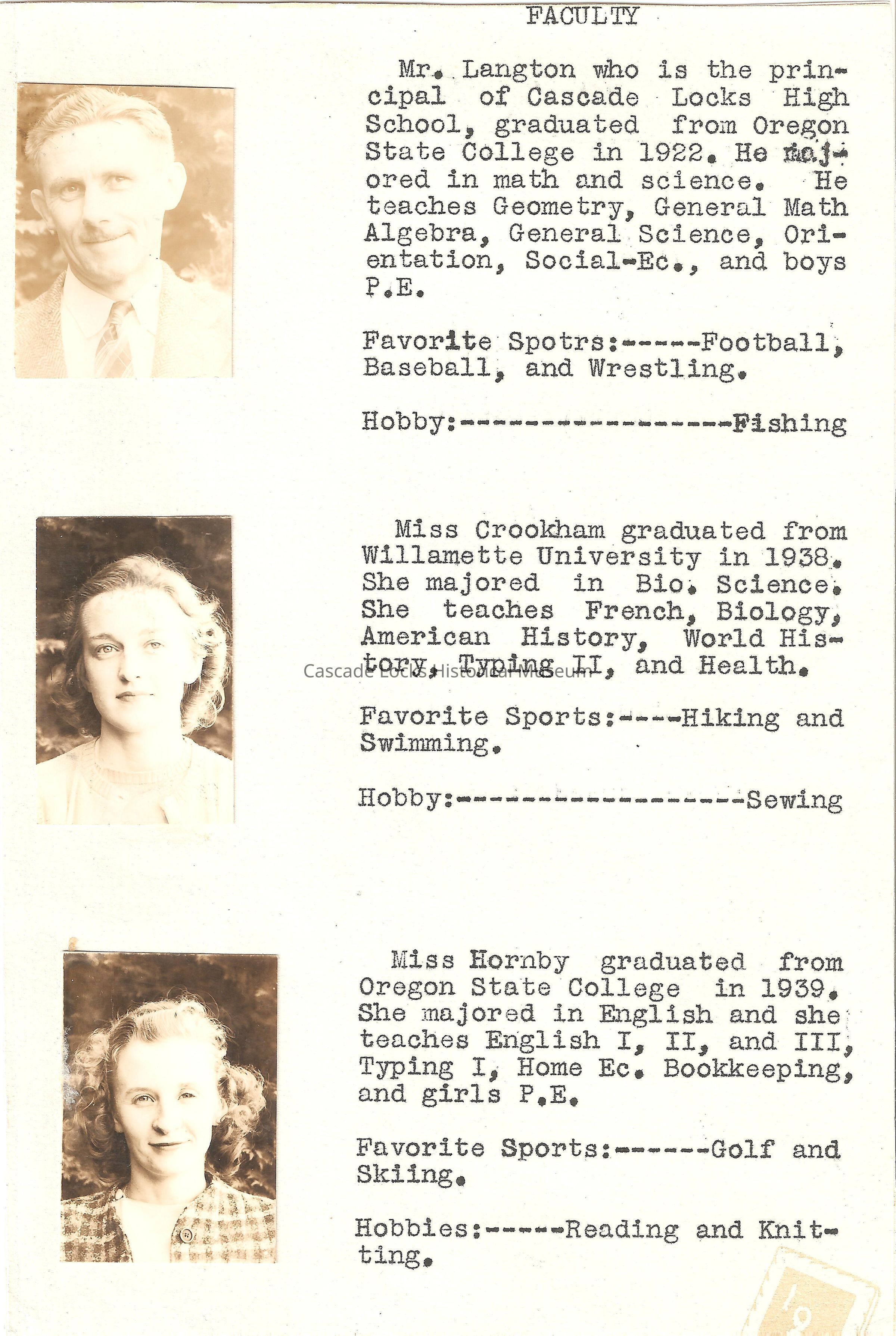 Mr. Langton who is the principal of Cascade Locks High School, graduated from Oregon State College in 1922. He majored in math and science. He teaches Geometry, General Math Algebra, Orientation, Social -Ec., and boys P.E. Favorite Sports: Football, Basketball, and Wrestling. Hobby: Fishing.