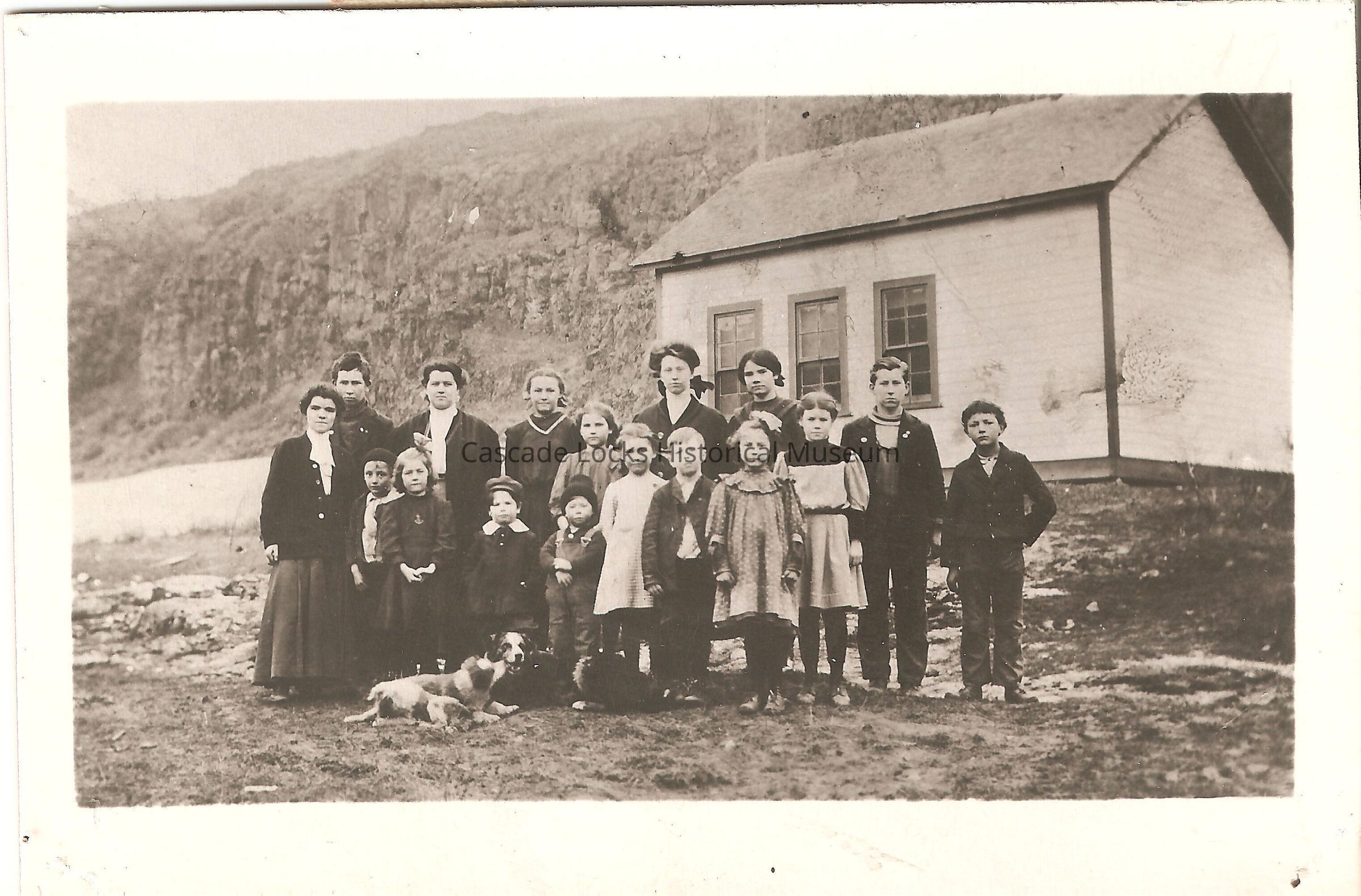 Photograph of a school kids from Cascade Locks standing outside of a wooden building. There are 17 people in the image. Back of picture says school at construction camp.
