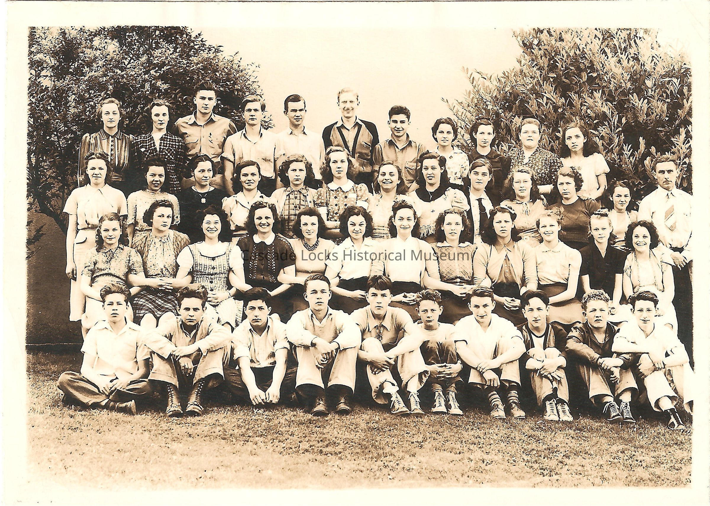 Photograph of a school kids from Cascade Locks posing outside. There are roughly 50 individual of which one is a teacher. Women students that are in skirts and blouses with cardigans and men are in button-up collared shirts and sweater vests.