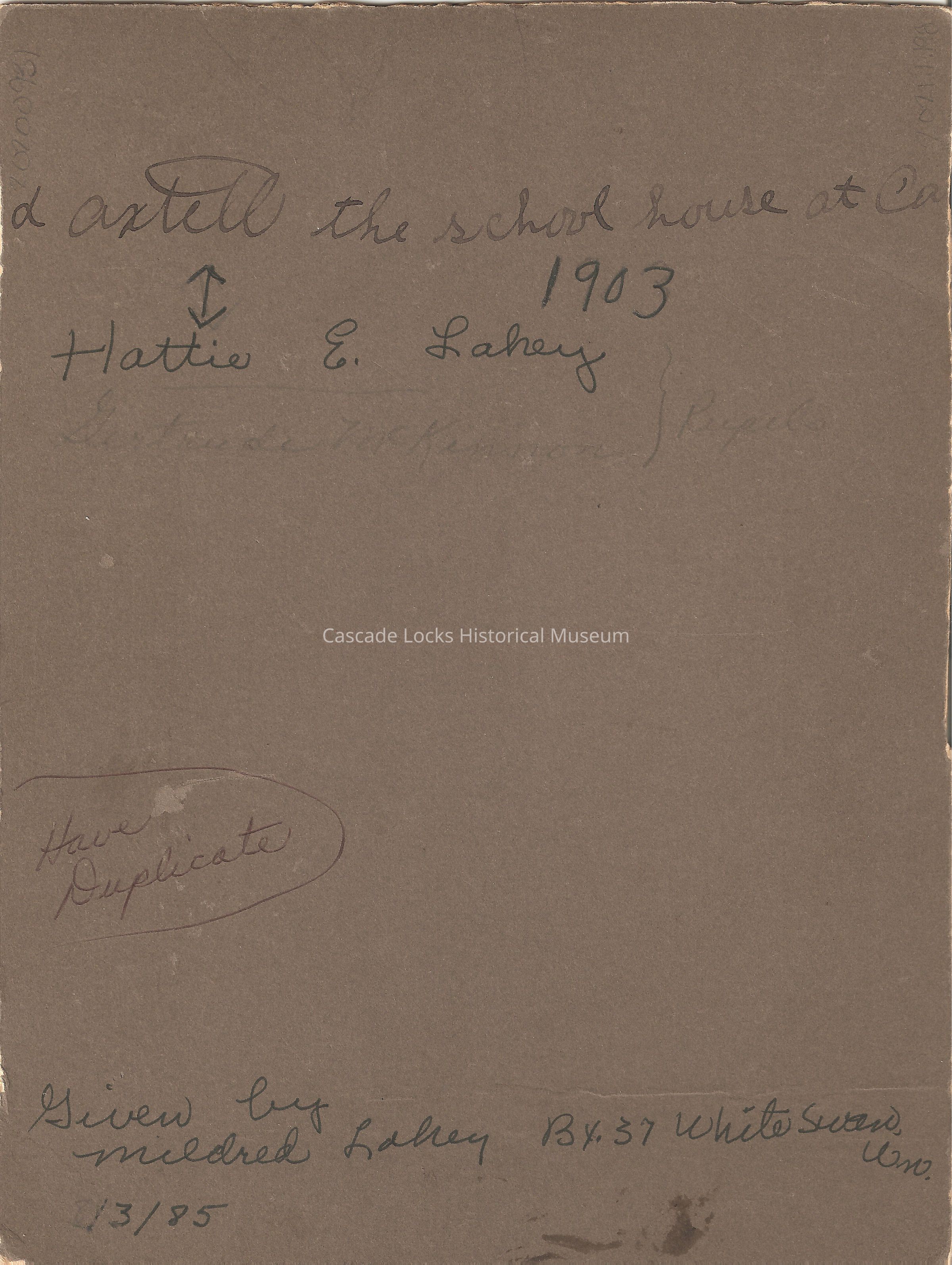 Back of card reads; The School House at Cascade Locks. Hattie Atwell E. Lahey, Gertrude McKennon, Pupils. 1903