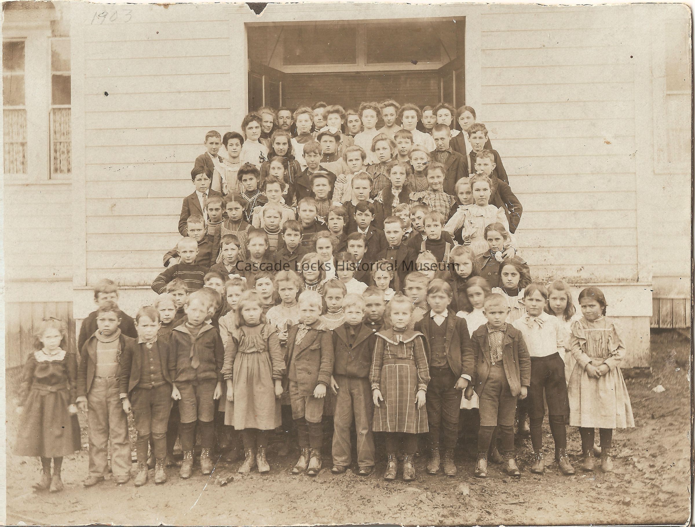 Photograph of a school house with school children year 1903. There are roughly 90 individuals standing outside the school building on the steps. Building is sided in thin slatted wood and pained glass windows.
