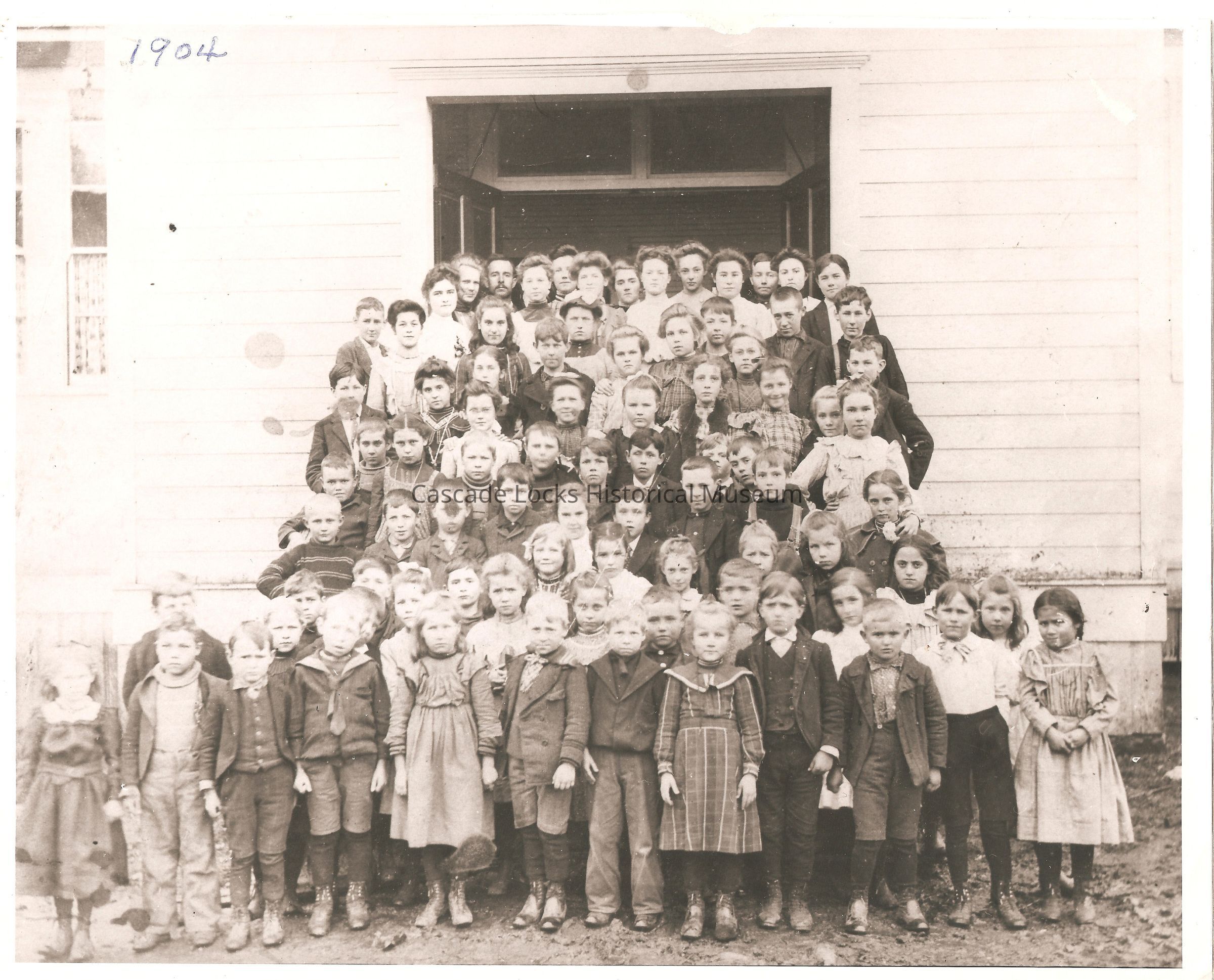 Photograph of a school house with school children year 1903. There are roughly 90 individuals standing outside the school building on the steps. Building is sided in thin slatted wood and pained glass windows. Upper left edge of image says 1904.