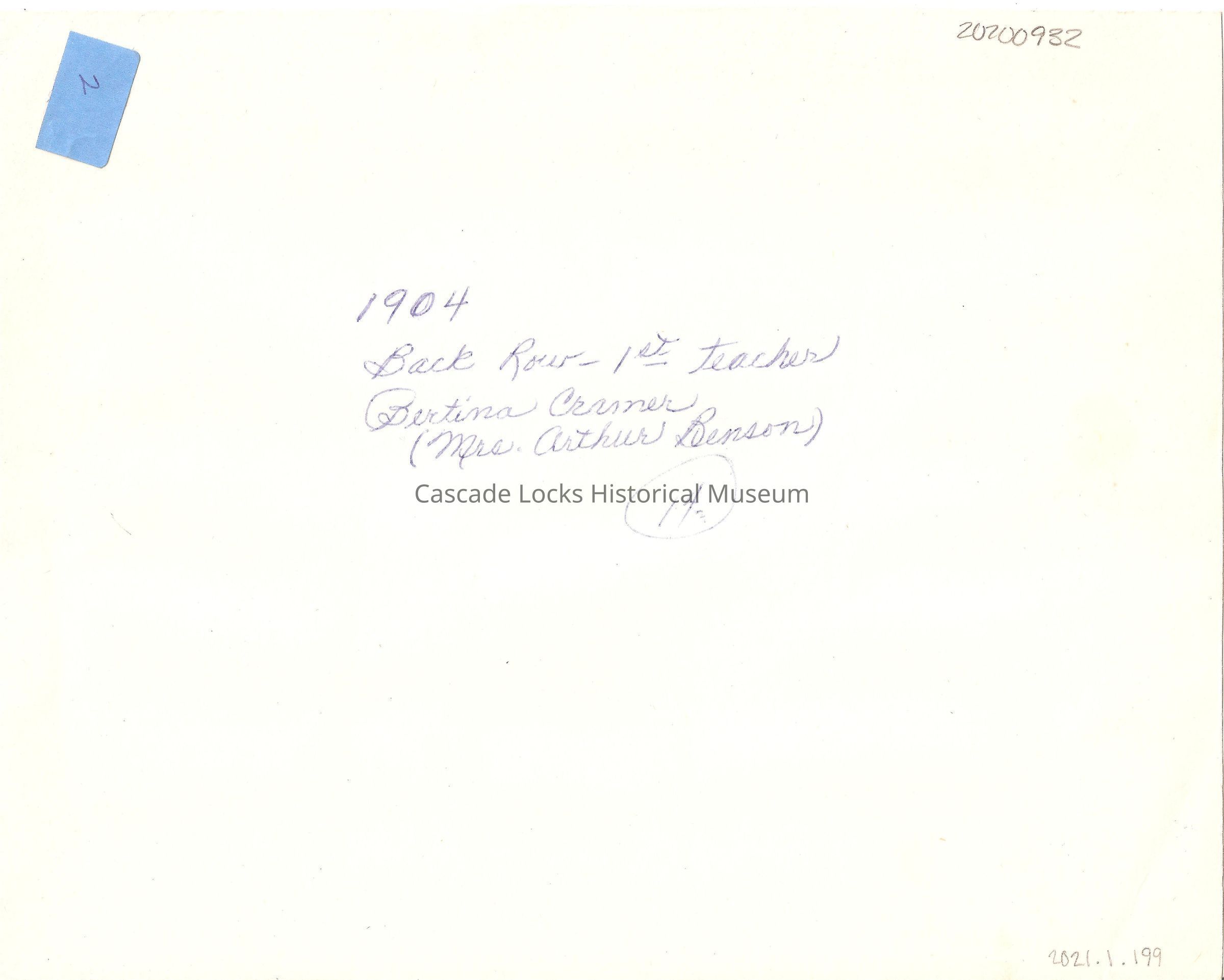 Back of card reads; 1904, Back Row- 1st Teacher-Bertina Cramer (Mrs. Arthur Benson).