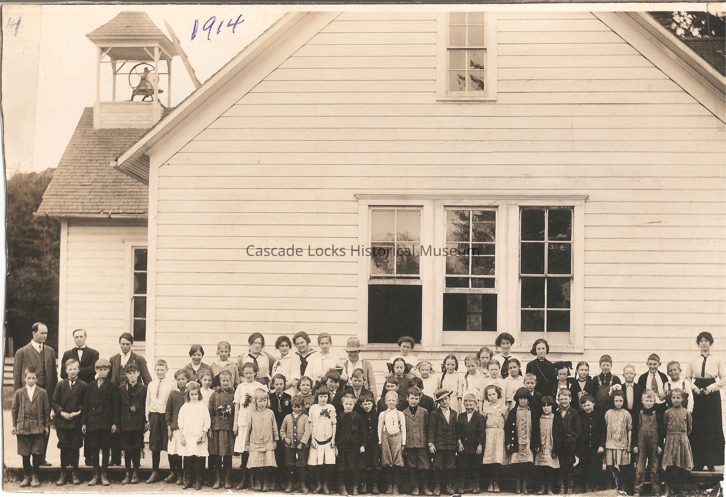Photograph of a school house with school children and teachers year 1914. There are roughly 60 individuals standing outside the school building. Building is sided in thin slatted wood with an A frame roof, bell tower, and pained glass windows. Building is T shaped with the top of the T being the lager of the building with a short entryway in the middle creating the T shape. There is a wooden walkway along the outside of the building that the back row of people are standing on.