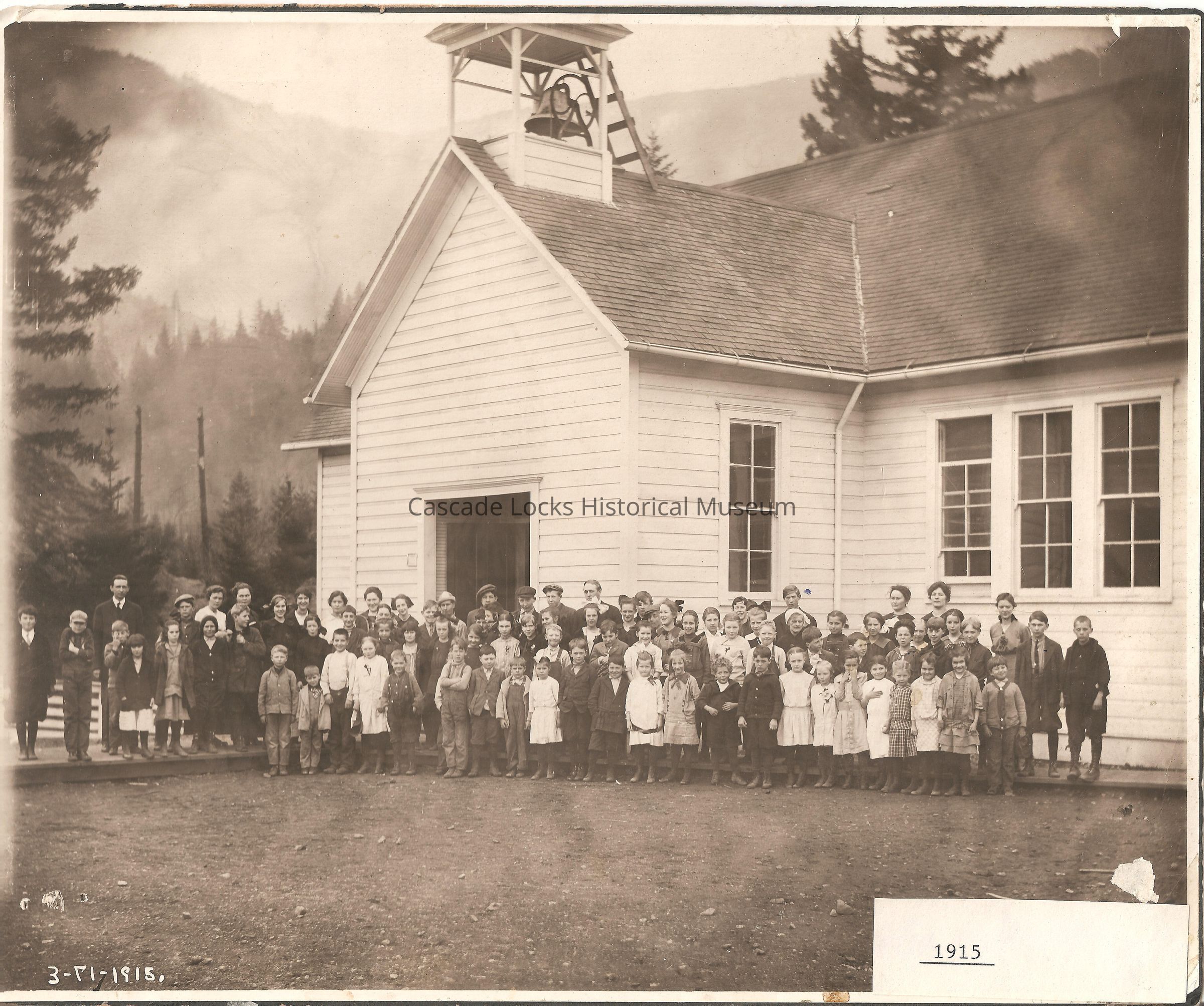 Photograph of a school house with school children and teachers year 1915. There are roughly 90 individuals standing outside the school building. Building is sided in thin slatted wood with an A frame roof, bell tower and pained glass windows. Building is T shaped with the top of the T being the lager of the building with a short entryway in the middle creating the T shape. Bottom left corner of the image says 3-11-1915. In the bottom right corner of the image there is a paper glued onto the image with 1915.