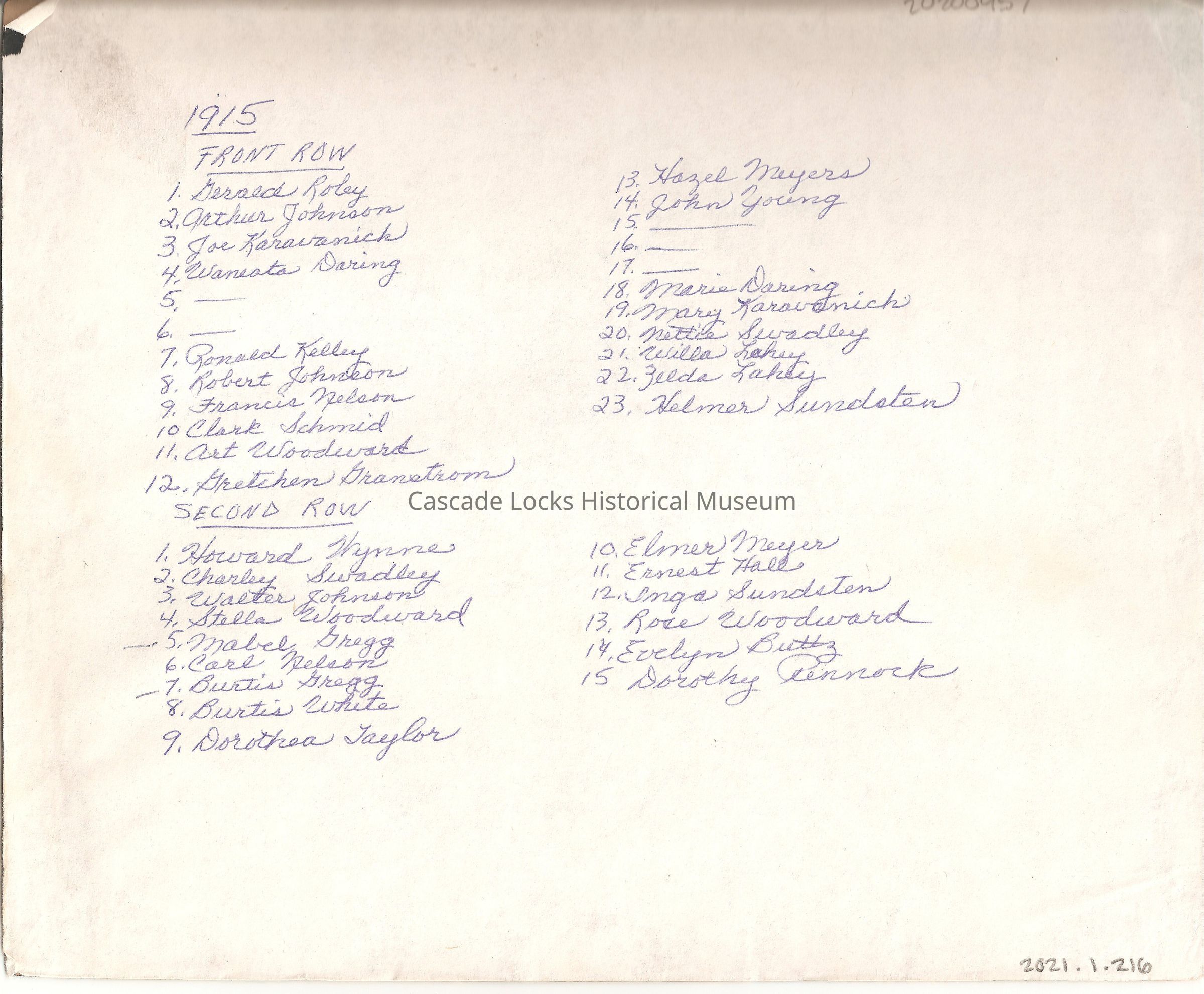 Back of card reads; 1915- Front Row- 1) Gerald Roley, 2) Arthur Johnson, 3) Joe Karavanick, 4) Waneato Daring, 5) __, 6) __, 7) Ronald Kelley, 8) Robert Johnson, 9) Francis Nelson, 10)Clark Schmidt, 11) Art Woodward, 12) Gretchen Granstrom. Second Row- 1) Howard Wynne, 2) Charley Swadley, 3) Walter Johnson, 4) Stella Woodward, 5) Mabel Gregg, 6) Carl Nelson, 7) Burtis white, 8) Burtis White, 9) Dorothea Taylor, 13) Hazel Meyers, 14) John Young, 15) ___, 16) ___, 17) ___, 18) Marie Daring, 19) Mary Karavanick, 20) Nettie Swadley, 21) Willa Lahey, 22) Zelda Lahey, 23) Helmer Sundsten 10) Elmer Meyer, 11) Ernest Hall, 12) Inga Sundsten, 13) Rose Woodward,14) Evelyn Buttz,15) Dorthy PennockMade/Created