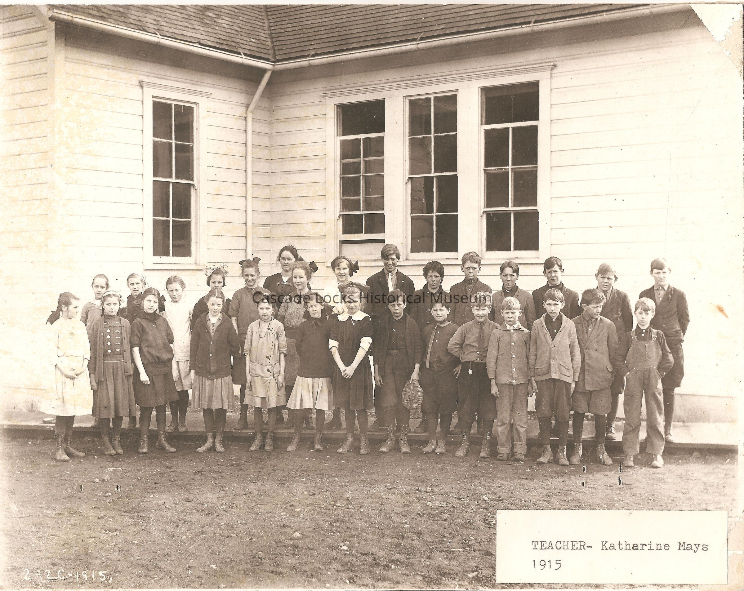 Photograph is of a group of roughly 30 individuals outside the schoolhouse year 1915. Girls are on the left of the image and boys are on the right of the image. Schoolhouse is small wooden slat sided with 4 tall pained windows. There is a sidewalk along the outside of the building that the back row of students and the teacher are standing on. The bottom left corner of the image says 2-20-1915. Right corner of the image has a glued paper that reads, Teacher- Katharine Mays, 1915.