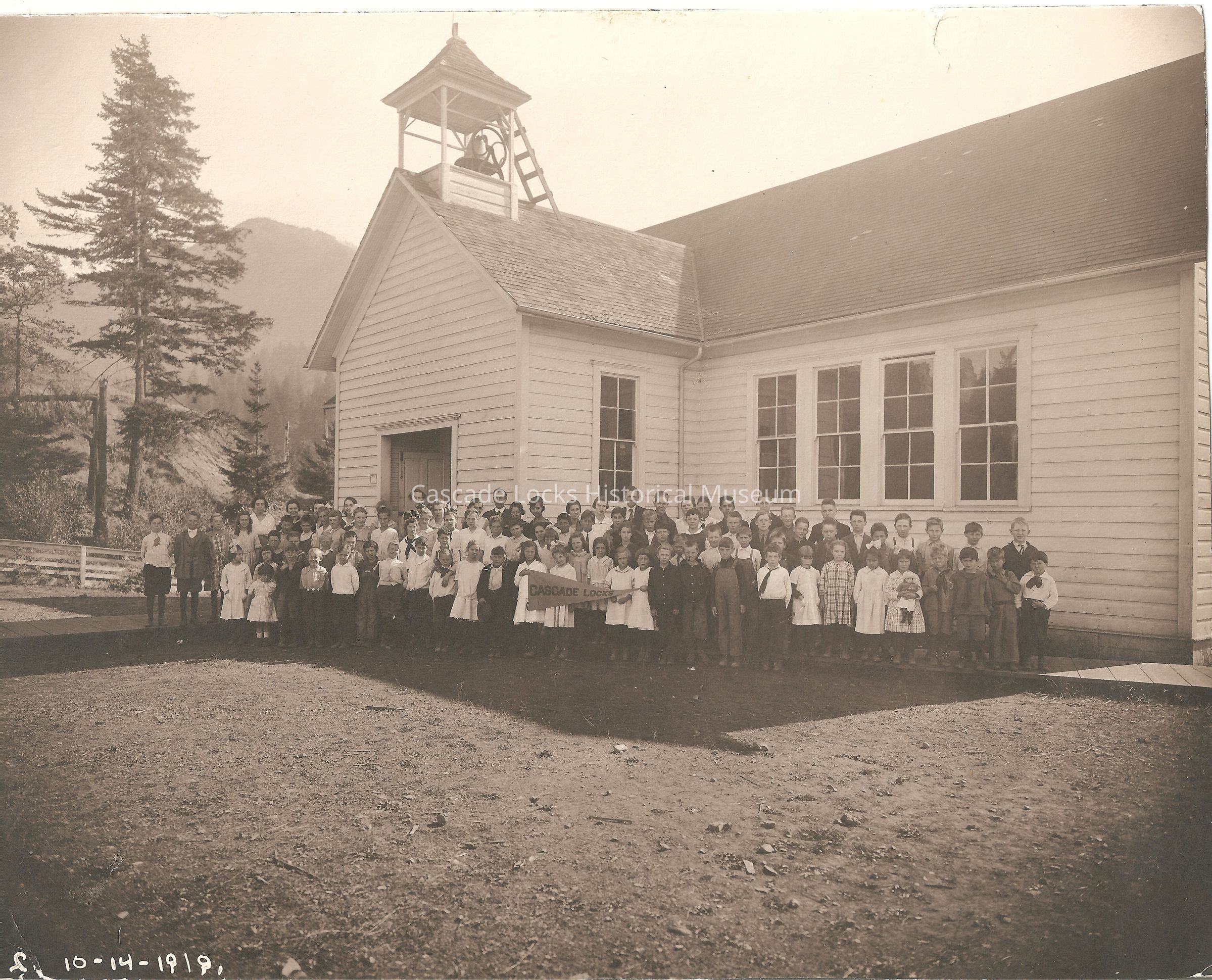 Photograph of a school house with school children and teachers year 1919. There are roughly 100 individuals standing outside the school building. Children in the front row are holding a pennant that says Cascade Locks. Building is sided in thin slatted wood with an A frame roof , bell tower and pained glass windows. Building is T shaped with the top of the T being the lager of the building with a short entryway in the middle creating the T shape. There is a wooden walkway along the outside of the building. In the bottom left corner is written 10-14-1919.