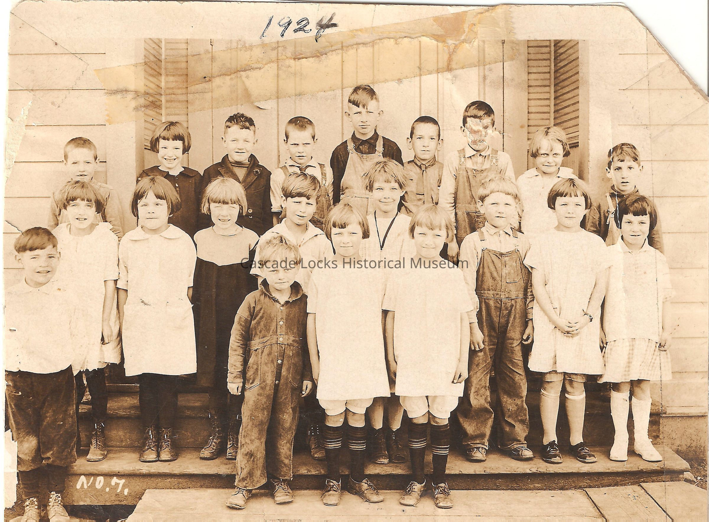 Photograph of a school kids from Cascade Locks posing outside of the school building on wooden steps. There are 20 students. Most girl students are light white/light slip dresses with bloomers and boys are in coveralls with under shirt or shorts and shirts. Written on top of card is 1924. Bottom left corner of image says No. 7.