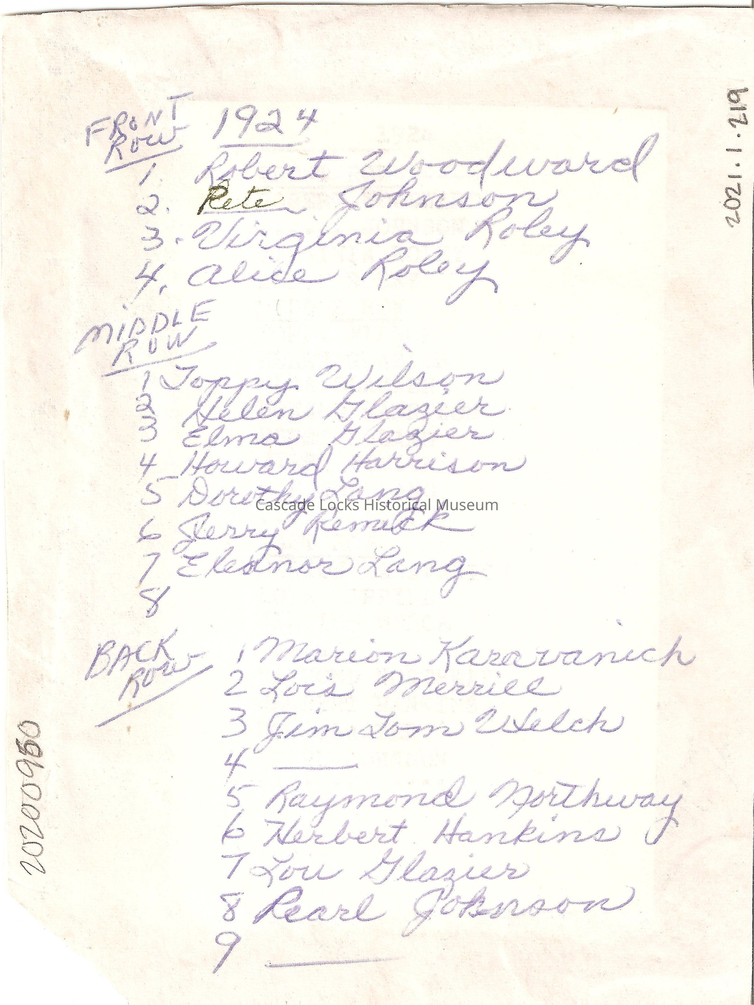 Back of card reads; 1924 Front Row- 1) Robert Woodward, 2) Reta Johnson, 3) Virginia Roley, 4) Alice Roley. Middle Row- 1) Toppy Wilson, 2) Helen Glazier, 3) Elma Glazier, 4) Howard Harrison, 5) Dorothy Long, 6) Jerry Remick, 7) Eleanor Lang, 8) _. Back Row- 1) Marion Kararvanich, 2) Lois Merrill, 3) Jim Tom Welch, 4) ___, 5) Raymond Northway, 6) Herbert Hankins, 7) Lou Glazier, 8) Pearl Johnson, 9)__.Language