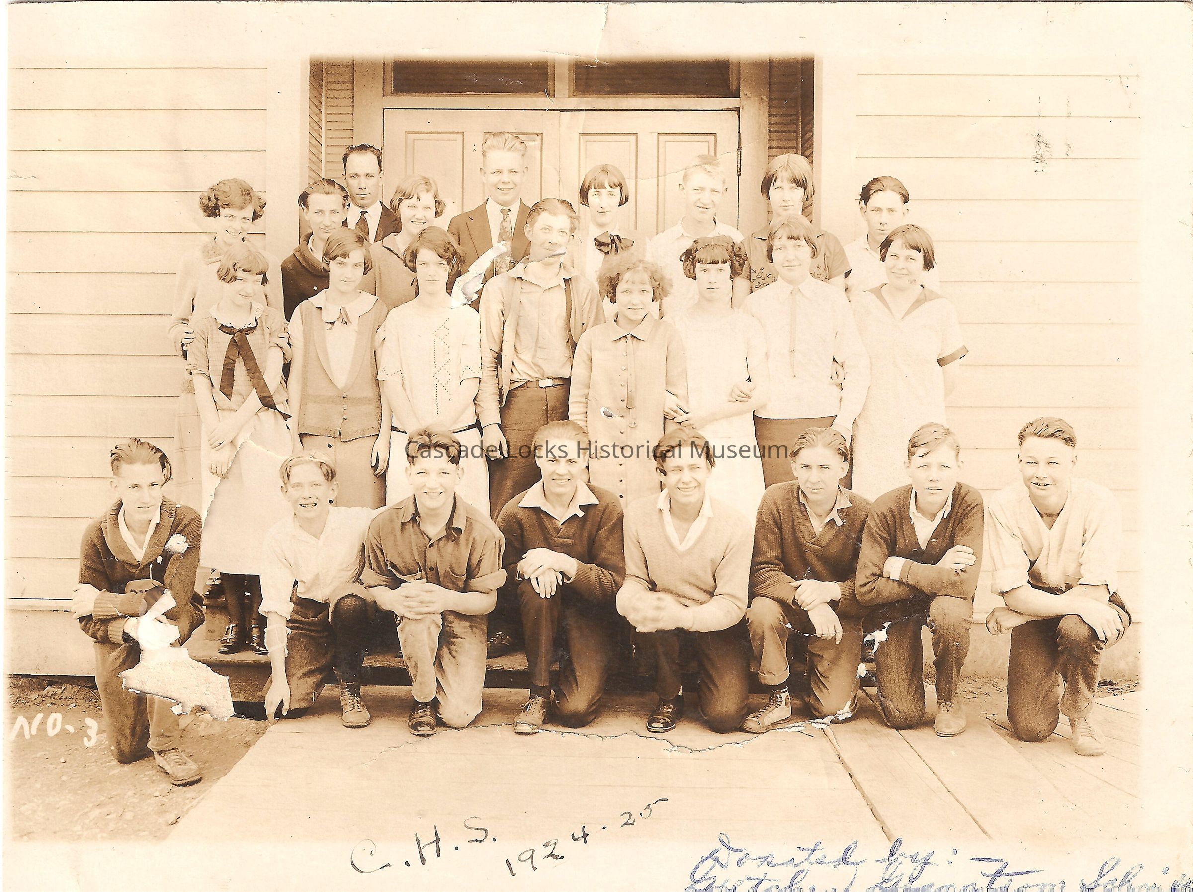 Photograph of a school kids from Cascade Locks posing outside of the school building on wooden steps. There are 24 students. Most women students are light white/light slip dresses with dropped waists. Most men are in sweaters and/or collared shirts. Written on the bottom of the card is C.H.S. 1924-25. Donated by Gretchen Granstrom Schmidt.