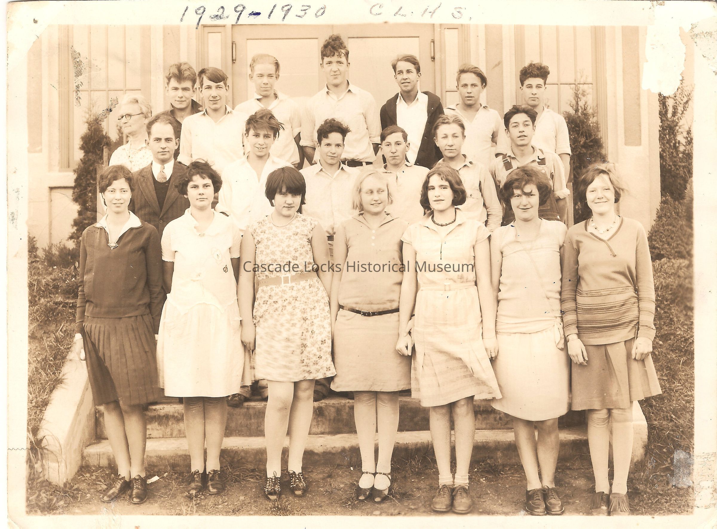 Photograph is of a group of roughly 21 individuals outside the schoolhouse year 1929-1930. There are eight female students in the front row and one female teacher in the upper left of the students. There are 12 male students and one male teacher making up the back two rows. Females are wearing skirts and shirts or dresses all with low dropped waists common of the 1920's. The males are wearing button up collared shirts. Top of card reads 1929-1930 C.L.H.S.