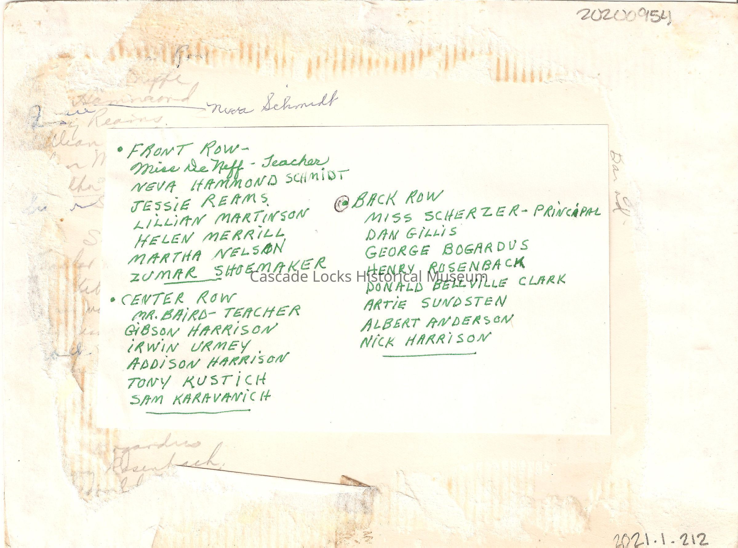 Back of card reads; Front Row- Miss Deneff- Teacher, Neva Hammond Schmidt, Jessie Reams, Lillian Martinson, Helen Merrill, Martha Nelson, Zumar Shoemaker, Center Row, Mr. Baird- Teacher, Gilbert Harrison, Irwin Urmey, Addison Harrison, Tony Kustich, Sam Karavanich, Back Row-miss Scherzer- Principal, Dan Gillis, George Bogardus, Henry Rosenback, Donald Bellville Clark, Artie Sundsten, Albert Anderson, Nick Harrison.Made/Created