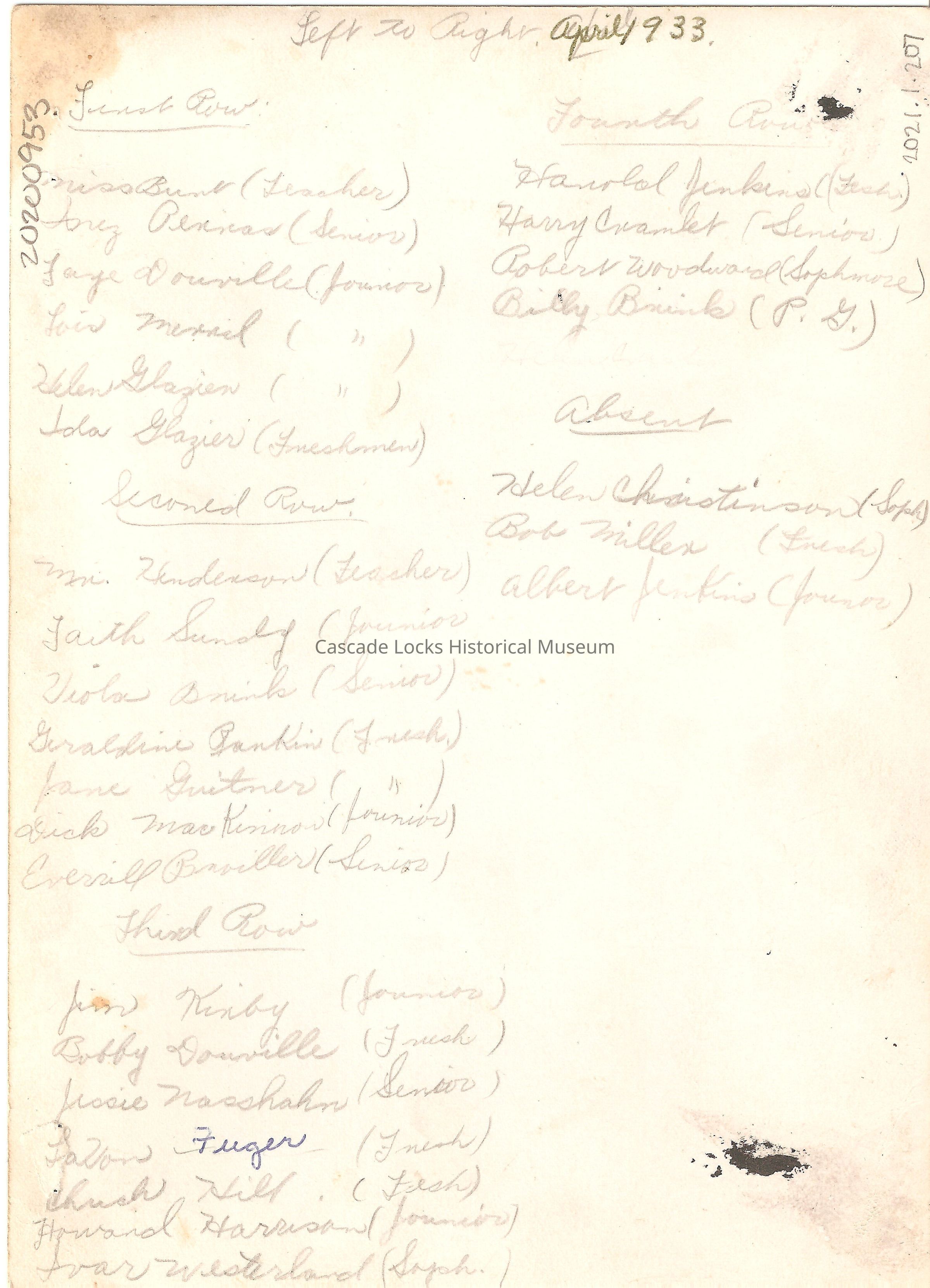 Back of card reads; April 1933- Right to Left- Front Row- Miss Bund Teacher, Anez Peniras Senior, Faye Douville Junior, Lois Merriell Junior, Helen Glazier Junior, Ida Glazier Freshman, Second Row- Mr. Henderson Teacher, Faith Sunly Junior, Uiolor Bruib Senior, Geraldine Jenkins Freshman, Jane Guitner Freshman, Dick Mac Broviller Senior, Everill Broviller Senior, Third Row- Jim Kirby Junior, Bobby Douville Freshman, Jessie Masshahn Senior, Fallon Fuger Freshman, Chuck Hill Freshman, Howard Harrison Junior, Juar Westerland Sophomore, Fourth Row- Hanobol Jenkins Freshman, Harry Crambelt Senior, Robert Woodward Sophomore, Billy Brinks (P.G.)Made/Created