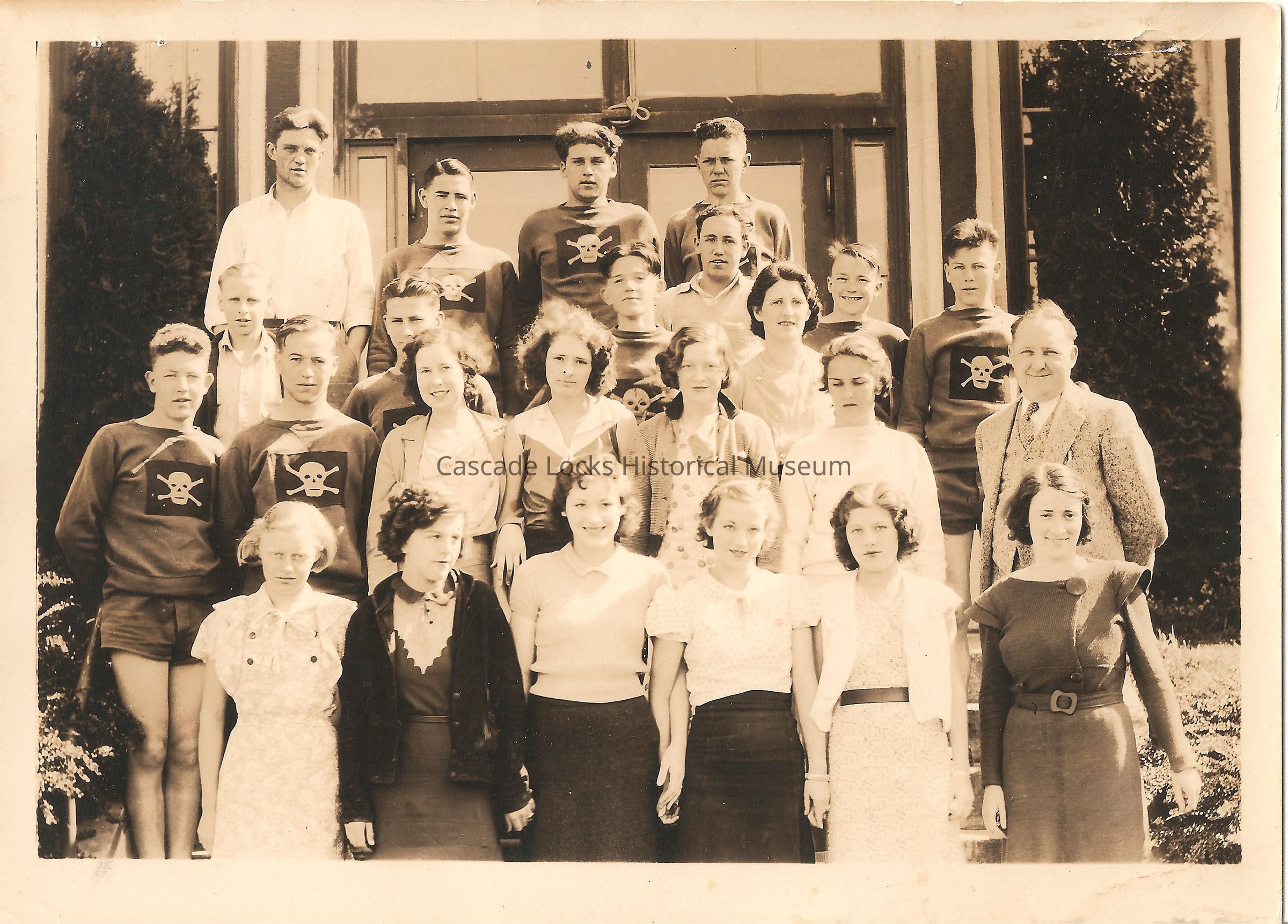 Photograph is of a group of roughly 24 individuals outside the schoolhouse. There are 10 female students in the front row and one female teacher. There are 12 male students and one male teacher making up the back two rows. Females are wearing skirts and shirts or dresses. The males are wearing button up collared shirts or long sleeve shirts with a skull and cross bones logo for the school mascot.