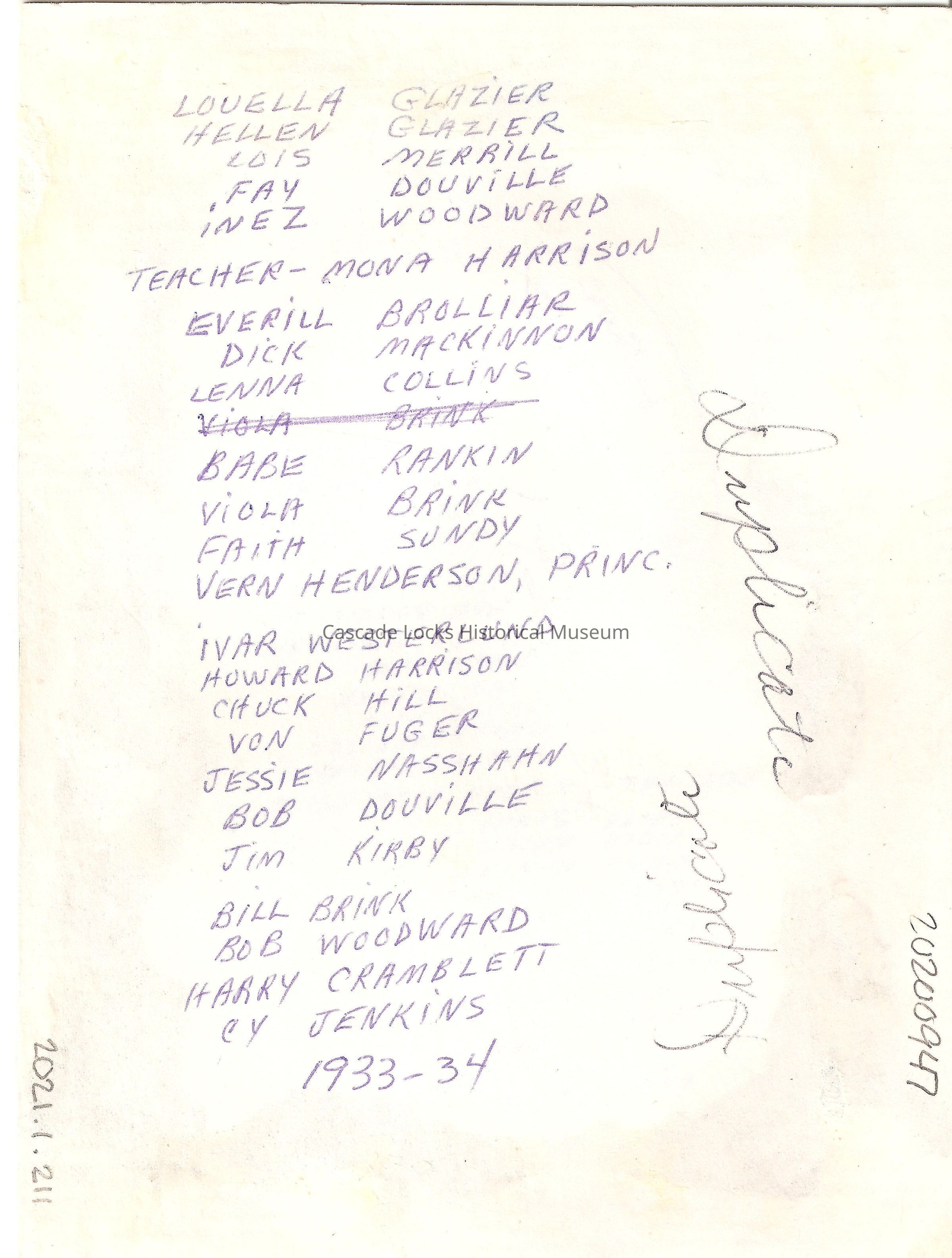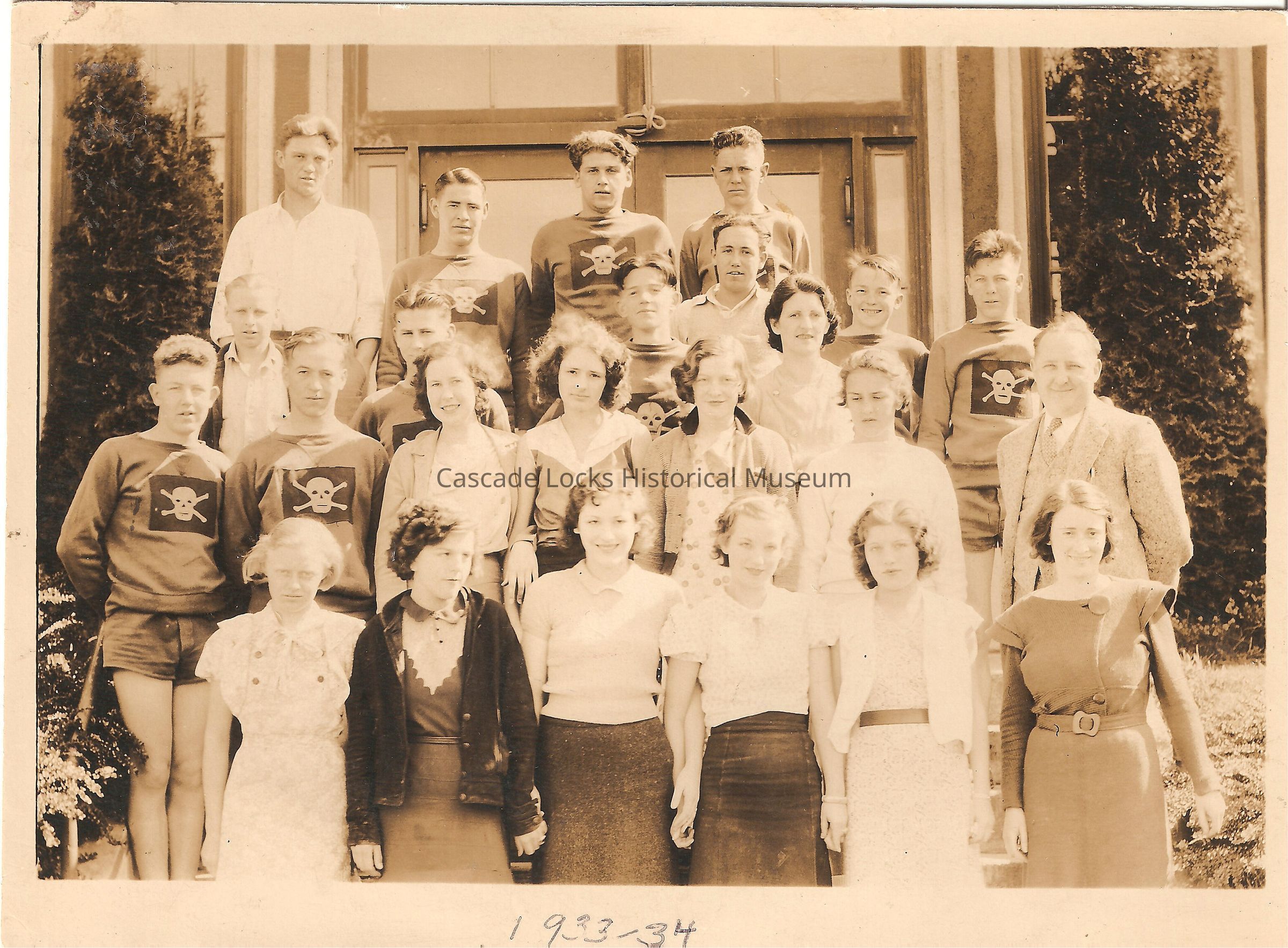 1933-34, Louella Glazier, Hellen Glazier, Lois Merrill, Fay Douville, Inez Woodward, Teacher Mona Harrison, Everill Brolliar, Dick Mackinnon, Lenna Collins, Babe Rankin, Viola Brink, Faith Sundy, Vern Henderson Principle, Ivar Westerlund, Howard Harrison, Chuck Hill, Von Gugar, Jessie Nasshahn, Bob Douville, Jim Kirby, Bill Brink, Bob woodward, Harry Crambelt, CY Jenkins,Language