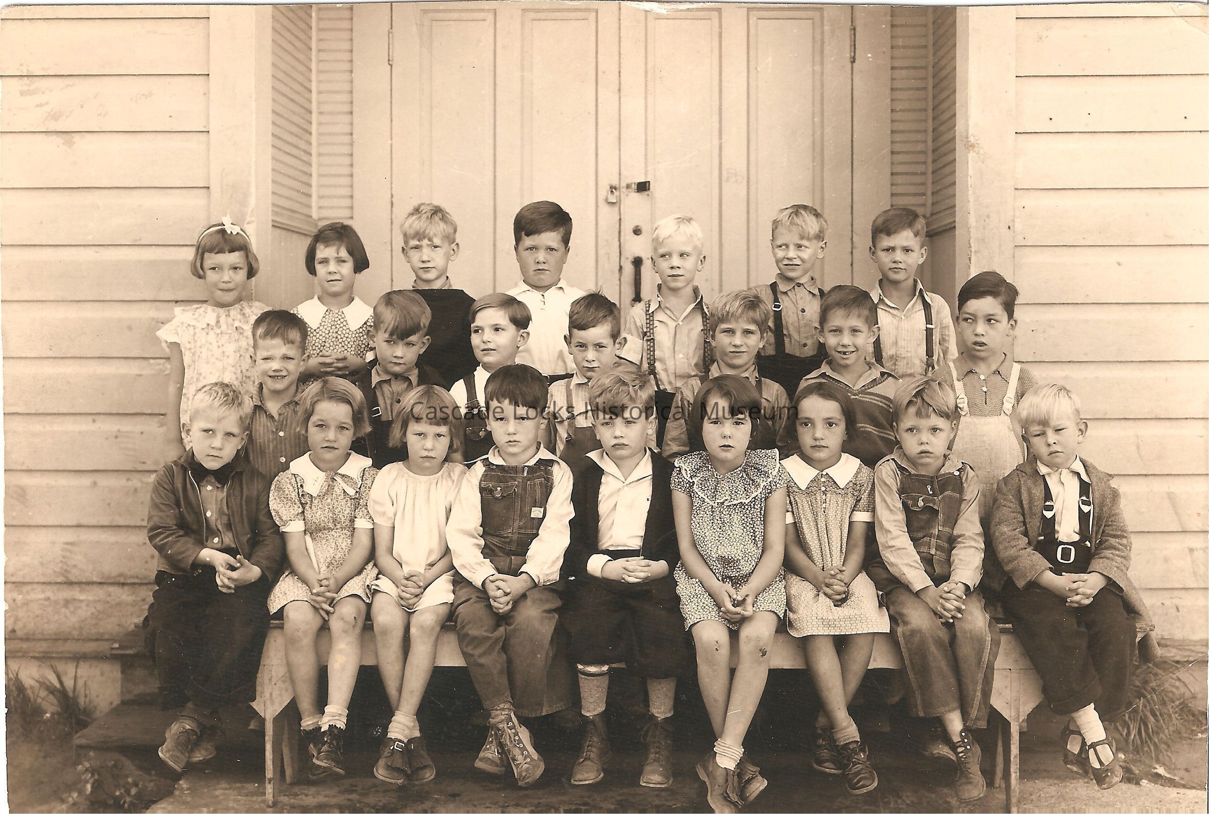 Taken by Lillian McLeod at Cascade Locks. 1st Grade Class of 1936-37 Mary Stillwell, Harry Crambelt, Middle of back row?Language