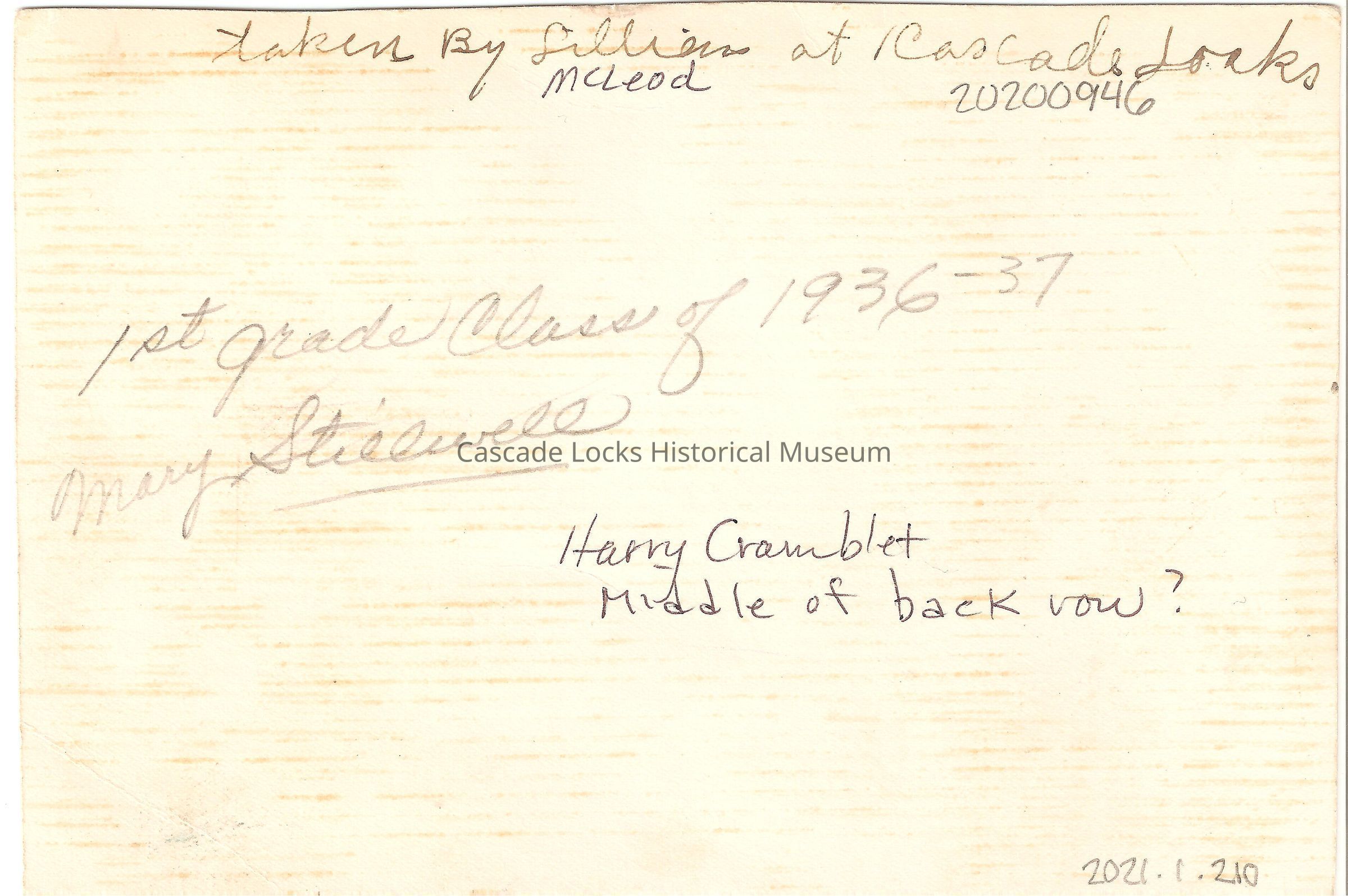 Back of card reads; Taken by Lillian McLeod at Cascade Locks. 1st Grade Class of 1936-37 Mary Stillwell, Harry Crambelt, Middle of back row?