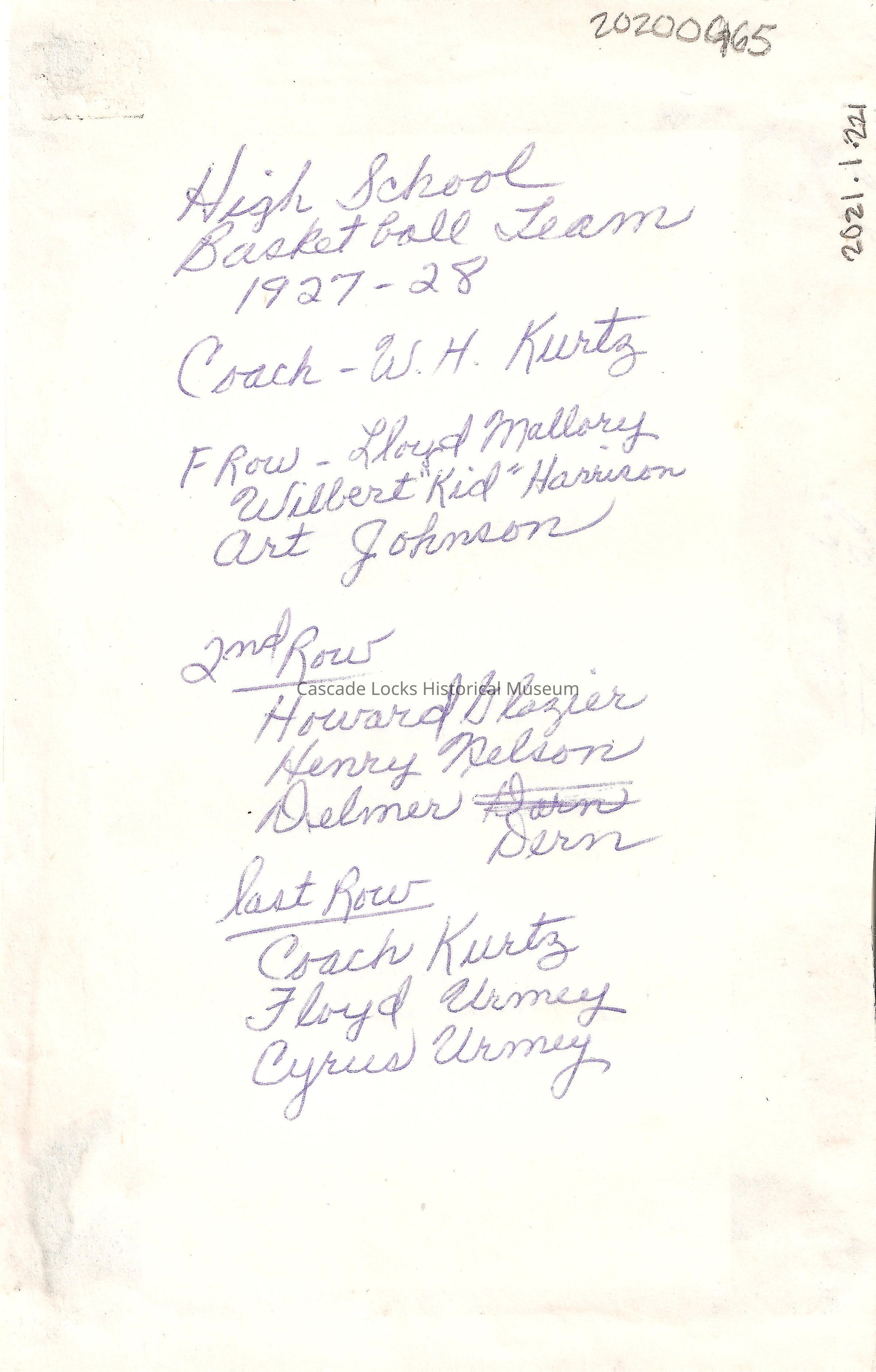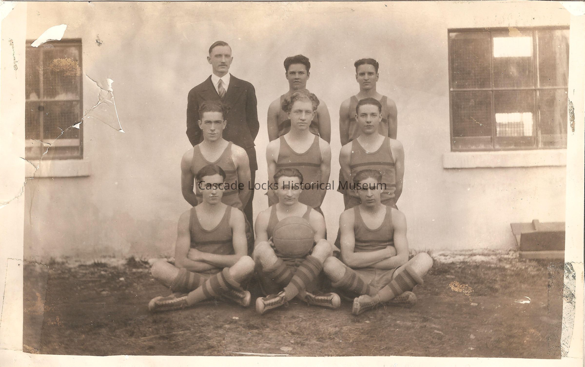 High School Basketball Team 1927-28. Coach -W. H. Kurtz (William Henry Kurtz) F. Row- Lloyd Mallory, Wilbert "Kid" Harrison, Art Johnson. 2d Row- Howard Glazier, Henry Nelson, Delmer Dern. Lat Row- Coach Kurtz, Floyd Urmey, Cyrus UrmeyLanguage