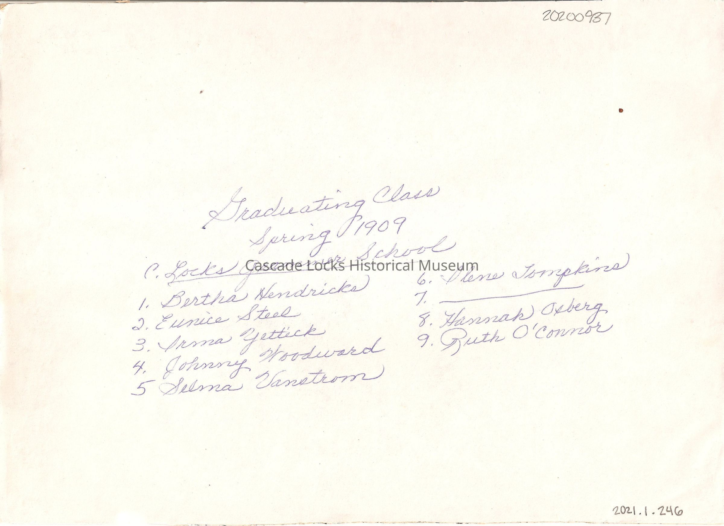 Back of card reads; Graduating Class, Spring 1909. Cascade Locks Grammar School. 1) Bertha Hendricks, 2) Eunice Steel, 3) Irma Yettick, 4) Johnny Woodward, 5) Selma Vanstrom 6) Ilene Tompkins, 7) _____, 8) Hannah Osberg, 9) Ruth O'connor