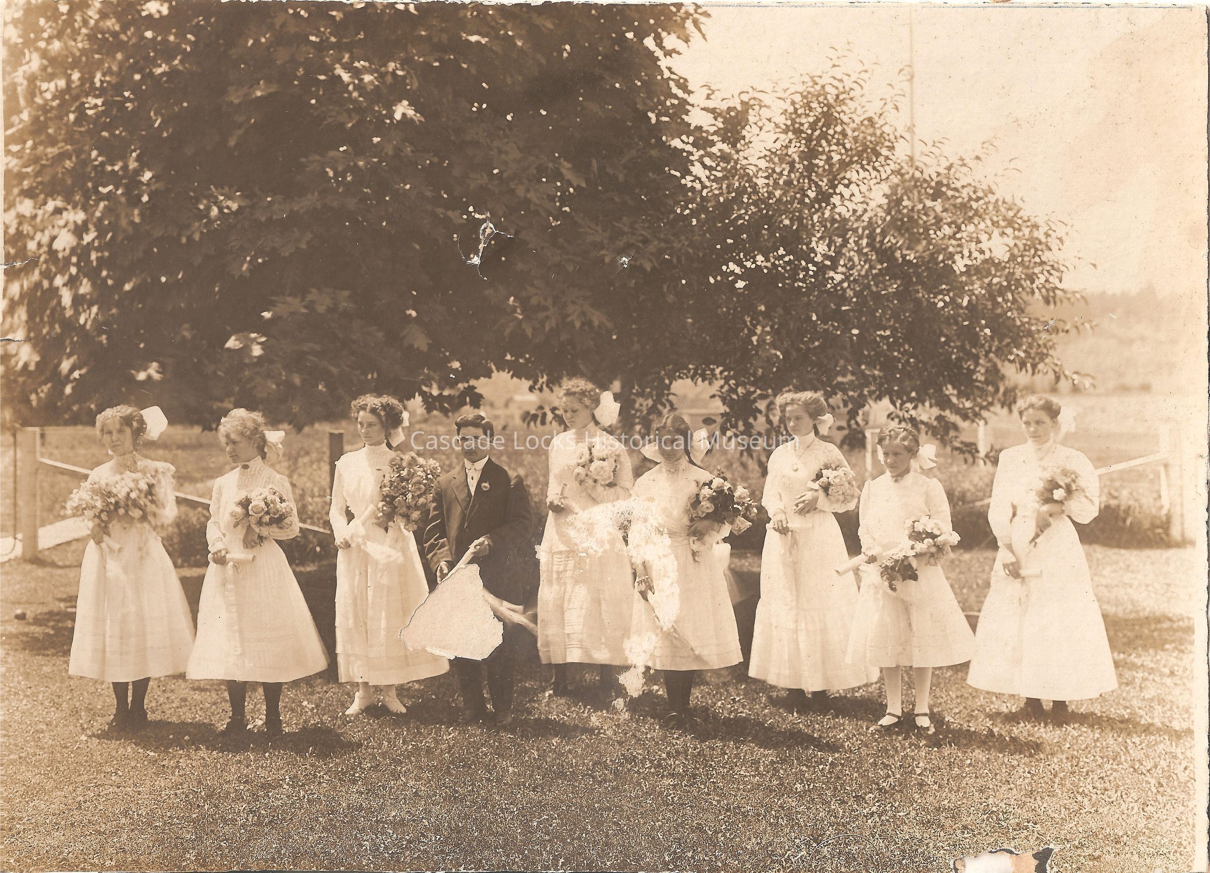 Photograph of the graduating class of 1909. There are nine individuals in the graduating class, 8 of which are women and one man. Women are all dresses in light/white dresses with high lace necks and collars with small variations among the dresses. Their hair is pulled back and tied with a light/white bow and either white/light tight or black tights. All women are holding bouquets of flowers. The man is wearing a suit with boutonnière and neck pin. Group is standing in a field of grass with a large tree in the background.