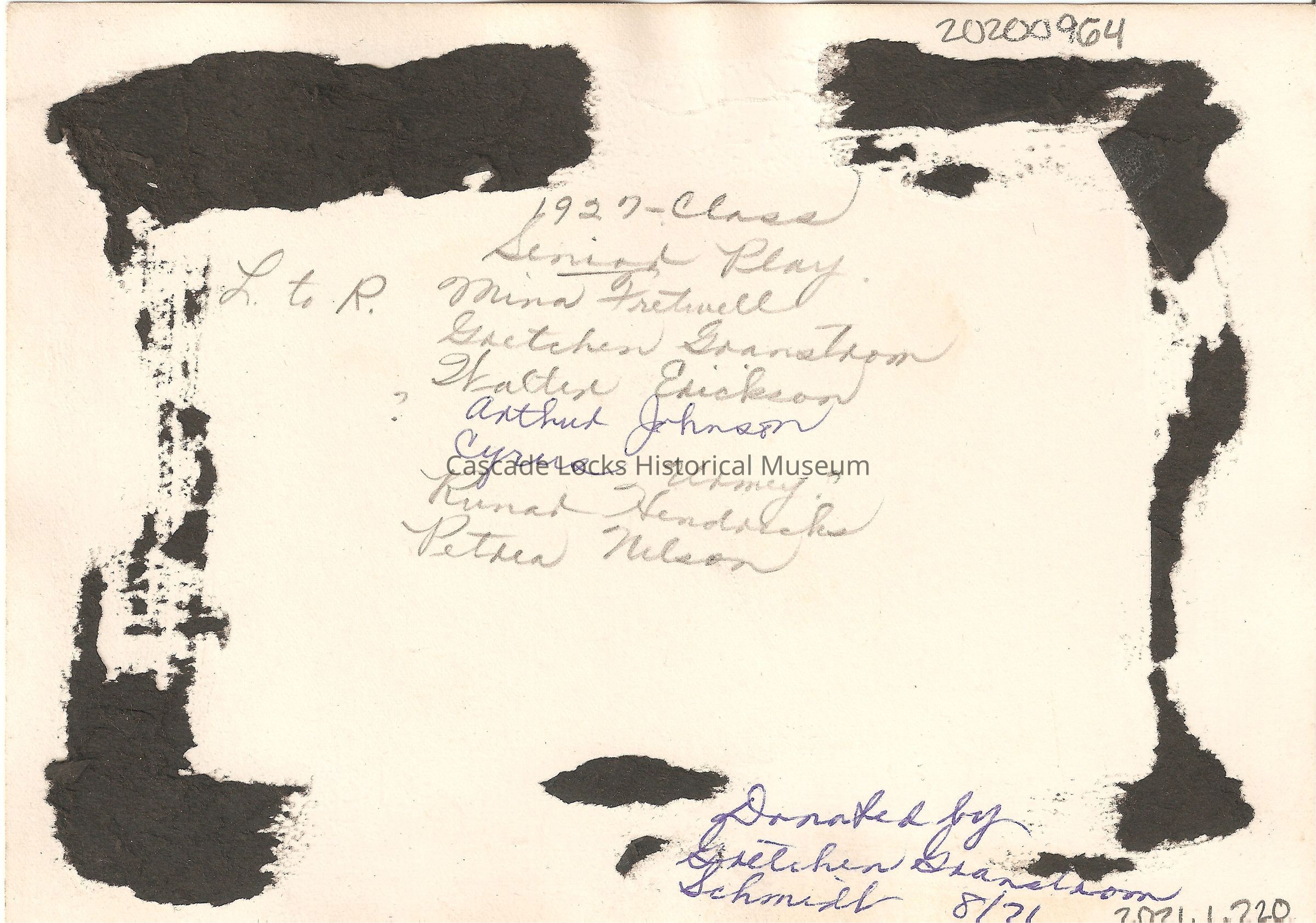 Front base of card has inscription of 1927- Senior Play.
