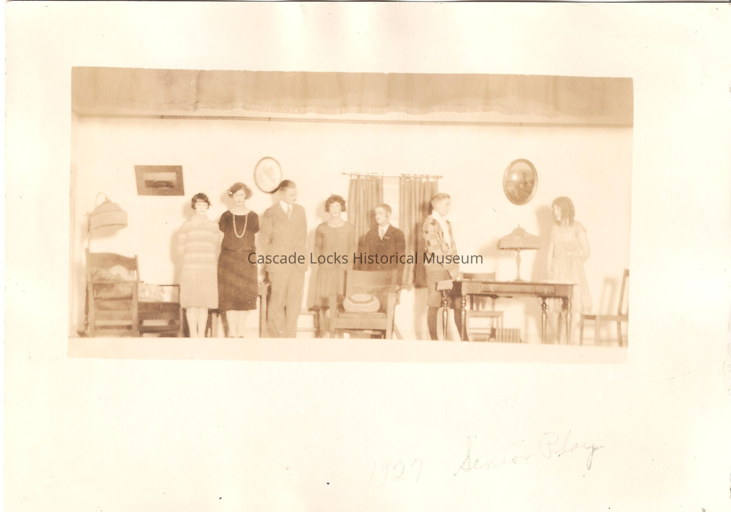 Photograph of a school musical or play on stage performing. The stage is made up of seven student performers that appear to be three females and four males dressed in costumes. Stage is set-up in a living room set-up. Front base of card has inscription of 1927- Senior Play.