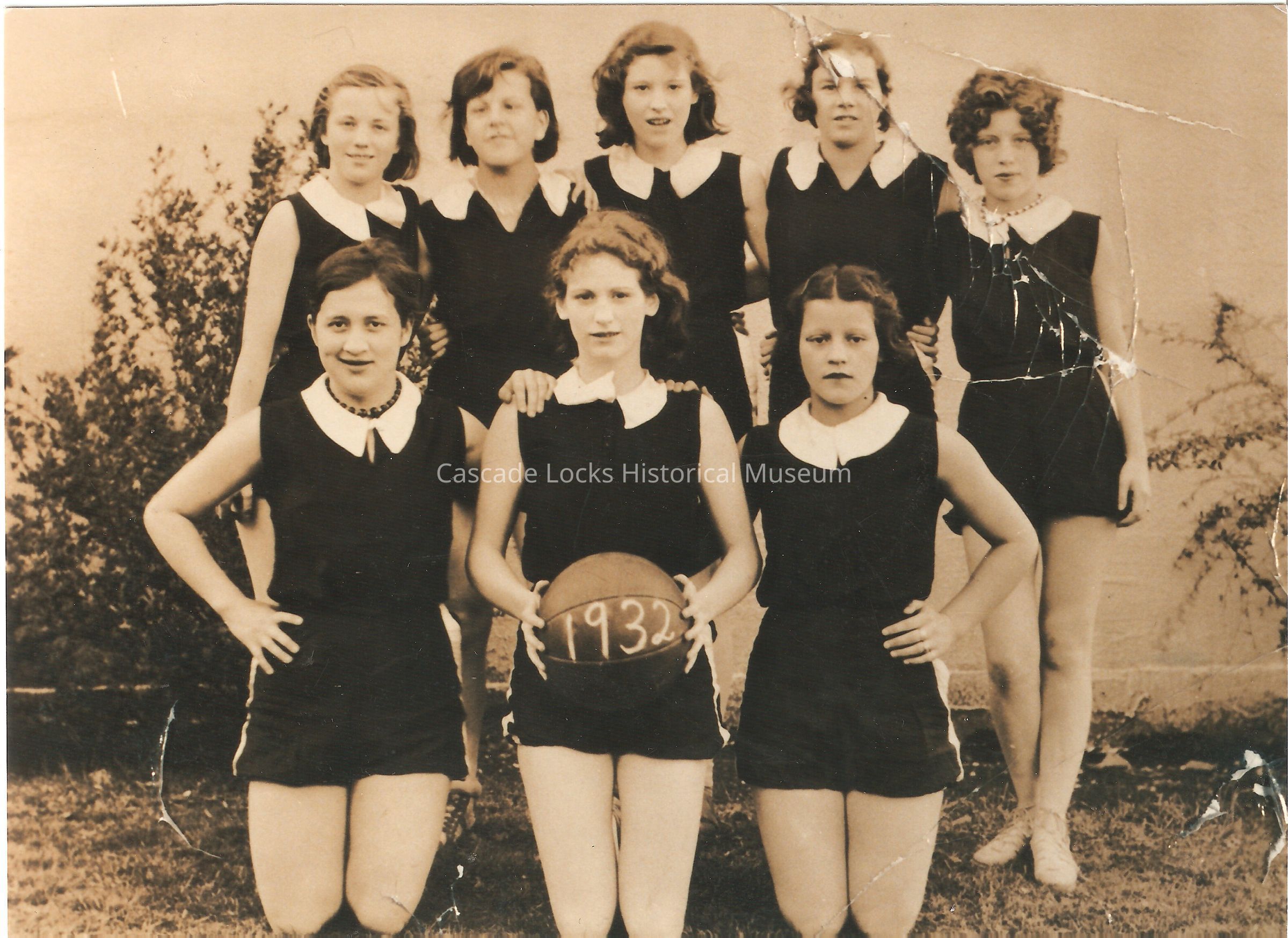 Photograph of a school women's basketball team. The team is made up of eight players. The players are in short shorts and and sleeveless shirts with high collars and while/light decorative collars that button in the middle. The middle player in the front row is holding a basketball with 1932 written on it.