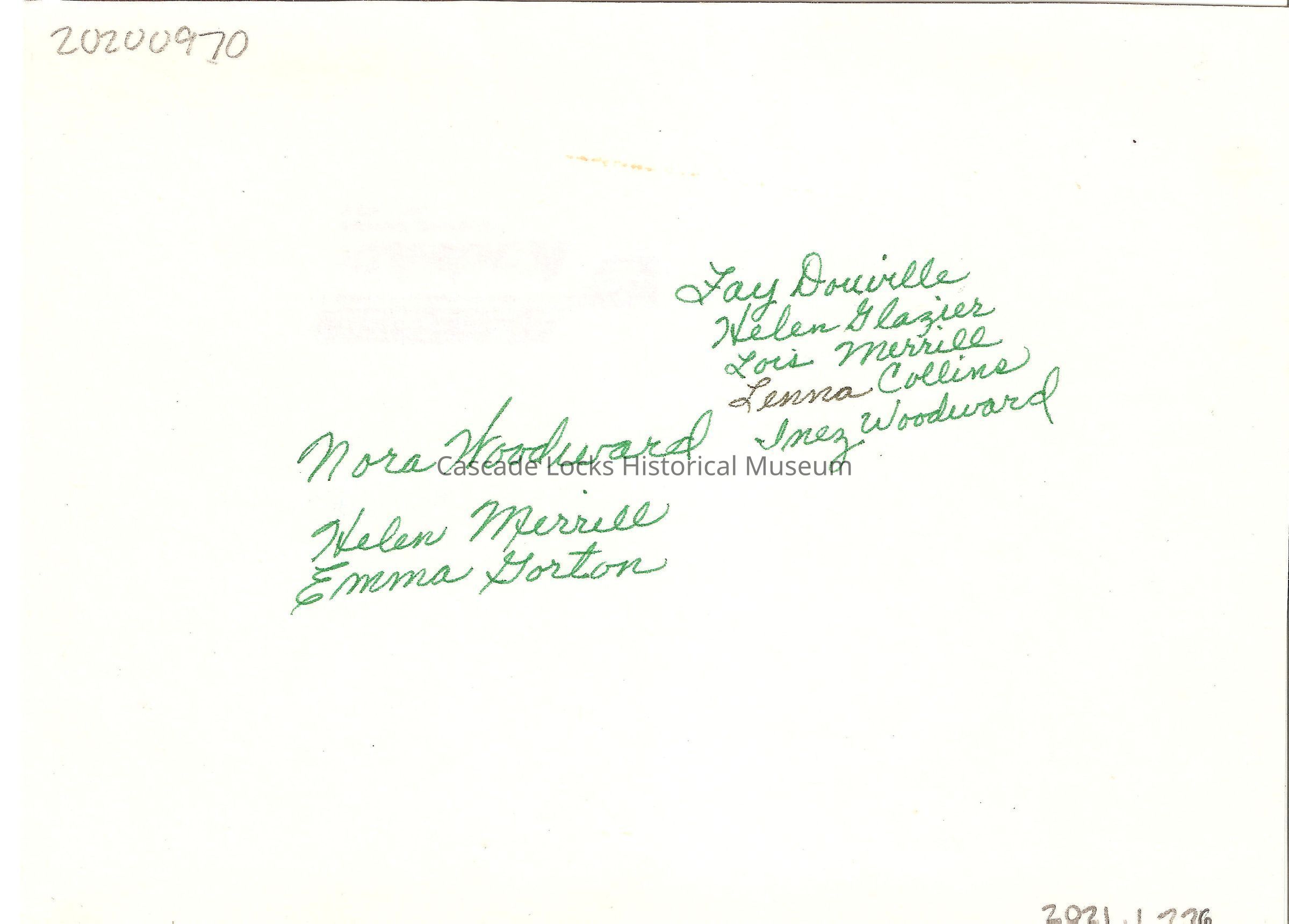 Back of card- First Row- Nora Woodward, Helen Merrill, Emma Norton, Second Row- Fay Douville, Helen Glazier, Lois Merill, Lenna Collins, Imez WoodwardMade/Created