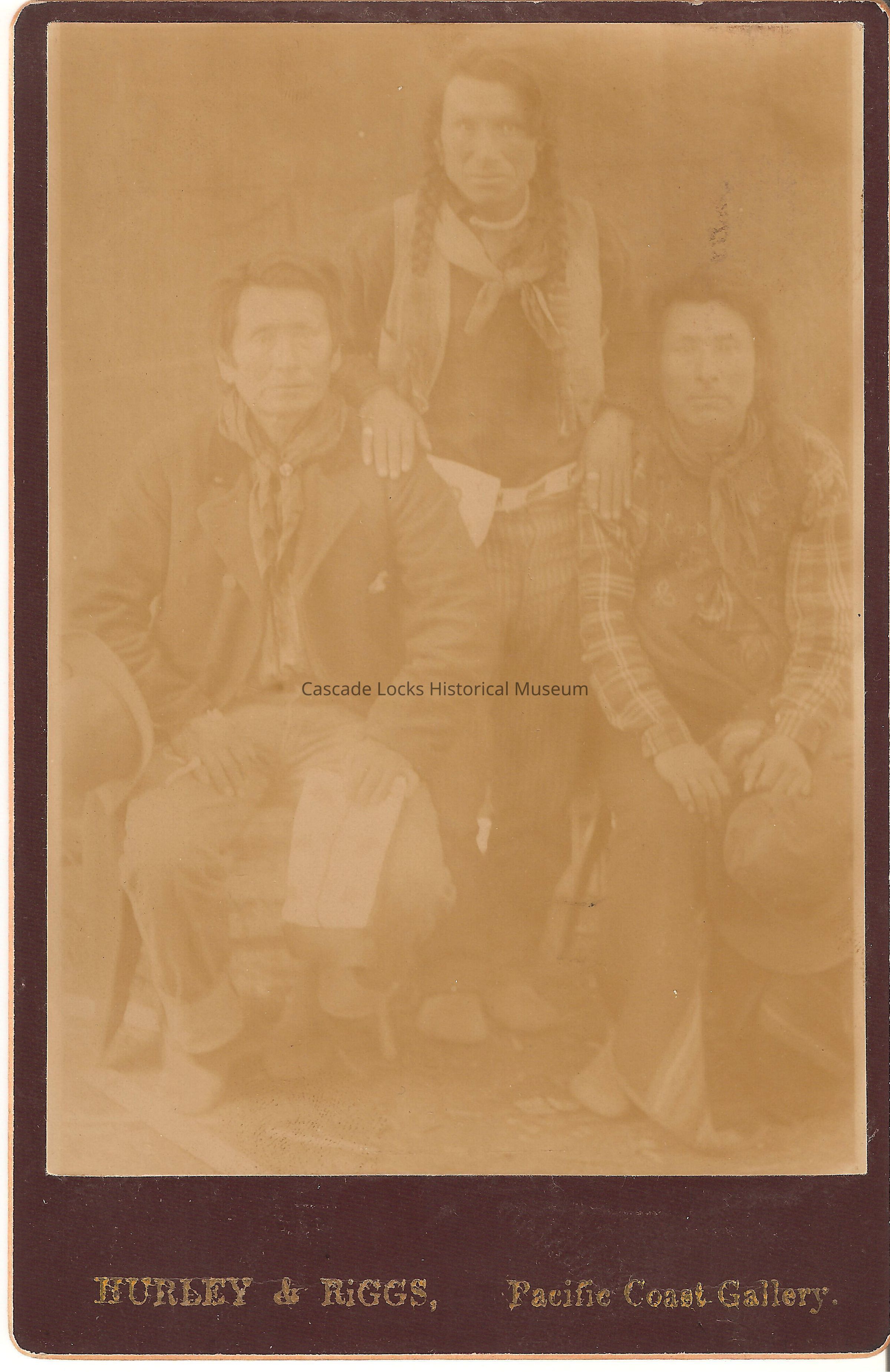 Photo portrait of three Native American men wearing Euro-American style clothing. the first man on the left has shirt dark hair wearing a over-coat and scarf tie. He is sitting in a chair and holding what appears to be a paper. the second man standing in the middle has long dark dark in two braids wearing a dark shirt, with light vest, scarf tie and light colored necklace. The third man has medium braided hair wearing a plaid long sleeve shirt with a vest , scarf tie and holding a hat. The vest is embroidered with patters, symbols, and markings. Image is in black and white. Image is on brownish-red cabinet card with gold. Card reads: Hurley & Riggs, Pacific Coast Gallery. Previously located in photo album 2020.1.19 photo slot 45.
