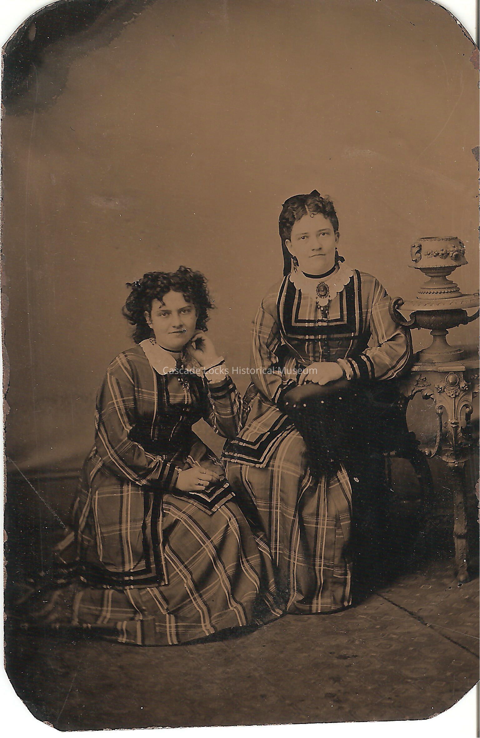 Photo portrait of two young women in plaid dresses. Image is in a tintype format and therefore chemically bound to a thin sheet of metal commonly tin. Back is blank due to the material used. Previously located in photo album 71.74.4 in spot number 25 donated by Margret Johnson.