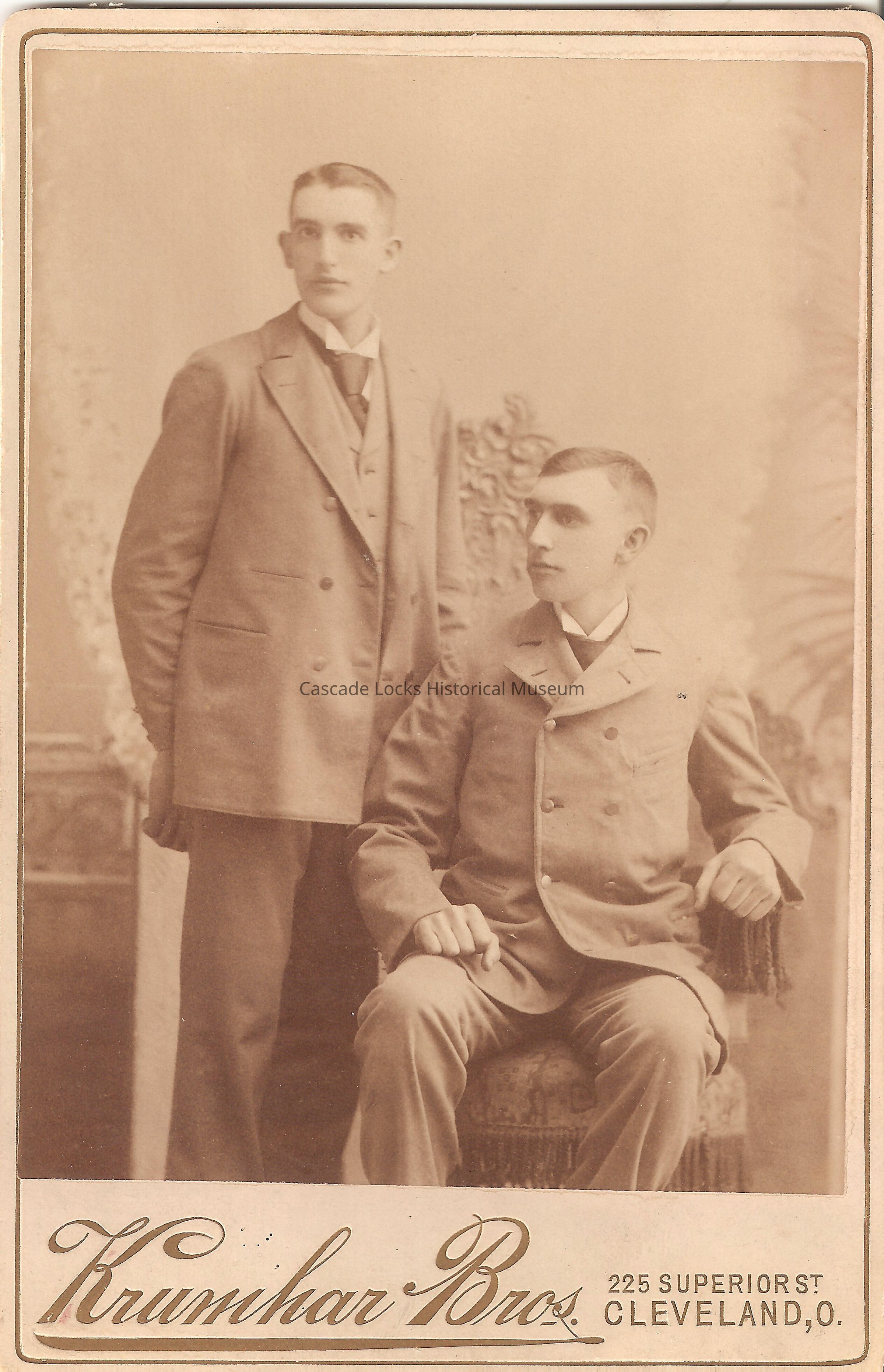 Photo portrait of two men, possibly twins, in matching three piece suits. Frist man on the left is standing with his suit coat open and the second man is sitting with his suit buttoned. Image is in black and white. Image is on white cabinet card with gold font. Card reads: Krumhar Bros. 225 Superior St. Cleveland, O. Previously located in photo album 2020.1.17