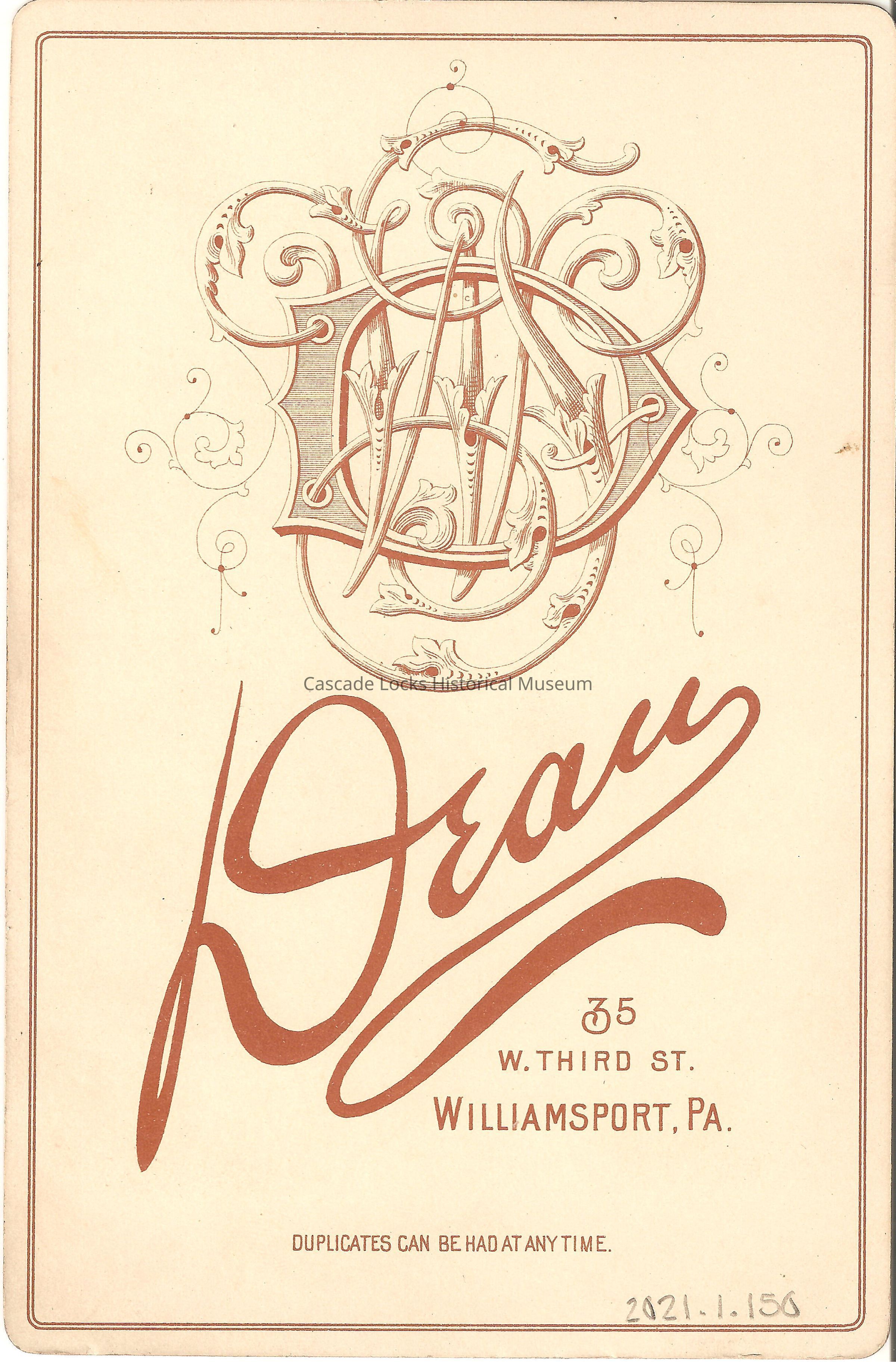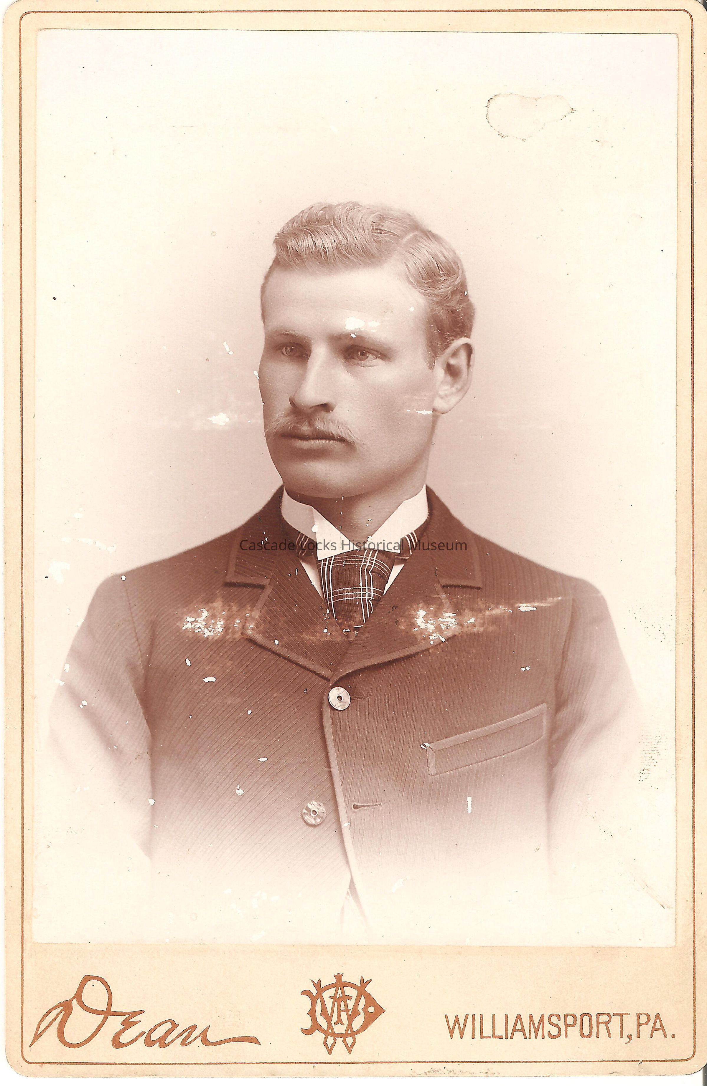Photo portrait of a light haired man with mustache wearing a suit jacket buttoned at the top and opened at the button paired with a plaid tie. Image is in black and white. Image is on off-white cabinet card. Back of card reads: Dean 35 W. Third St. Williamsport, PA. Duplicates can be had at any time. Previously located in photo album 2020.1.17