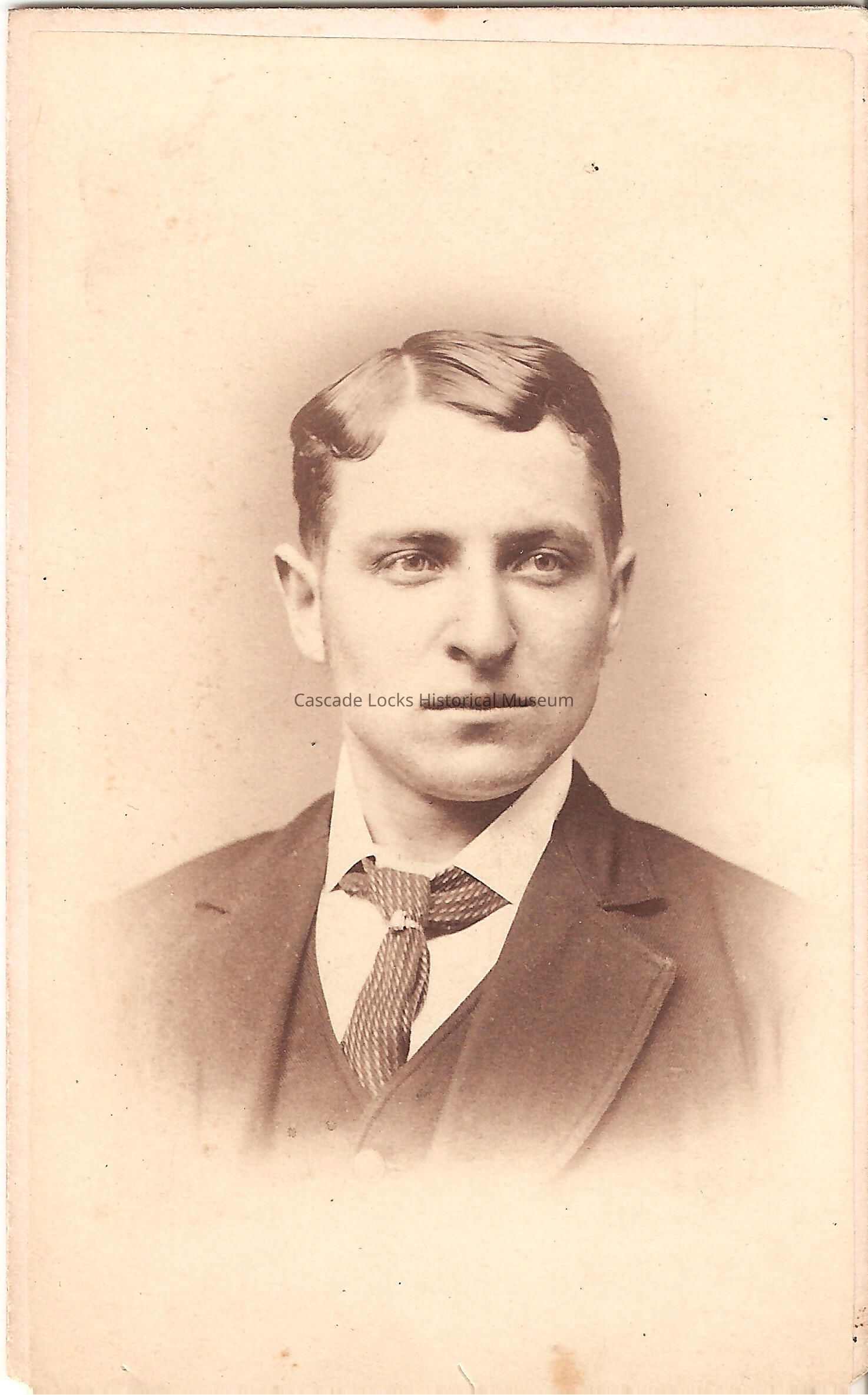 Photo portrait of a dark haired man with side part wearing a suit with suit vest, tie and tie pin. Image is in black and white. Image is on of-white cabinet card. Previously located in photo album 2020.1.17