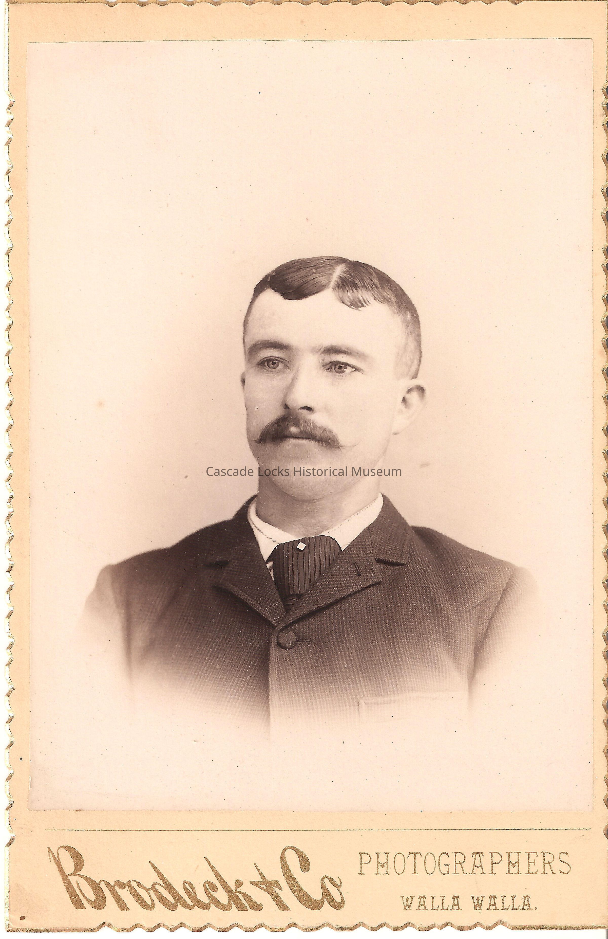Photo portrait of a man with light colored eyes, dark hair, and mustache wearing a suit with tie and tie pin. Image is in black and white. Image is on off-white cabinet card with gold edge. Card reads: Brodeck & Co. Photographers, Walla Walla. Previously located in photo album 2020.1.19 photo slot 15.
