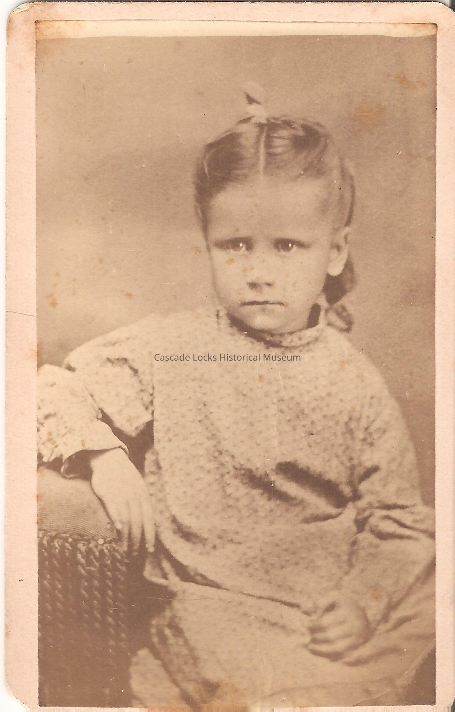 Photo portrait of a young girl medium to light hair in a small patterned simple dress with long sleeves. Image is in black and white. Image is on of-white cabinet card. Back of card reads: Lafe Wonders, Excelsior and Gallery, Alliance, Ohio. Negative preserved over 20,000 on hand. Previously located in photo album 2020.1.17