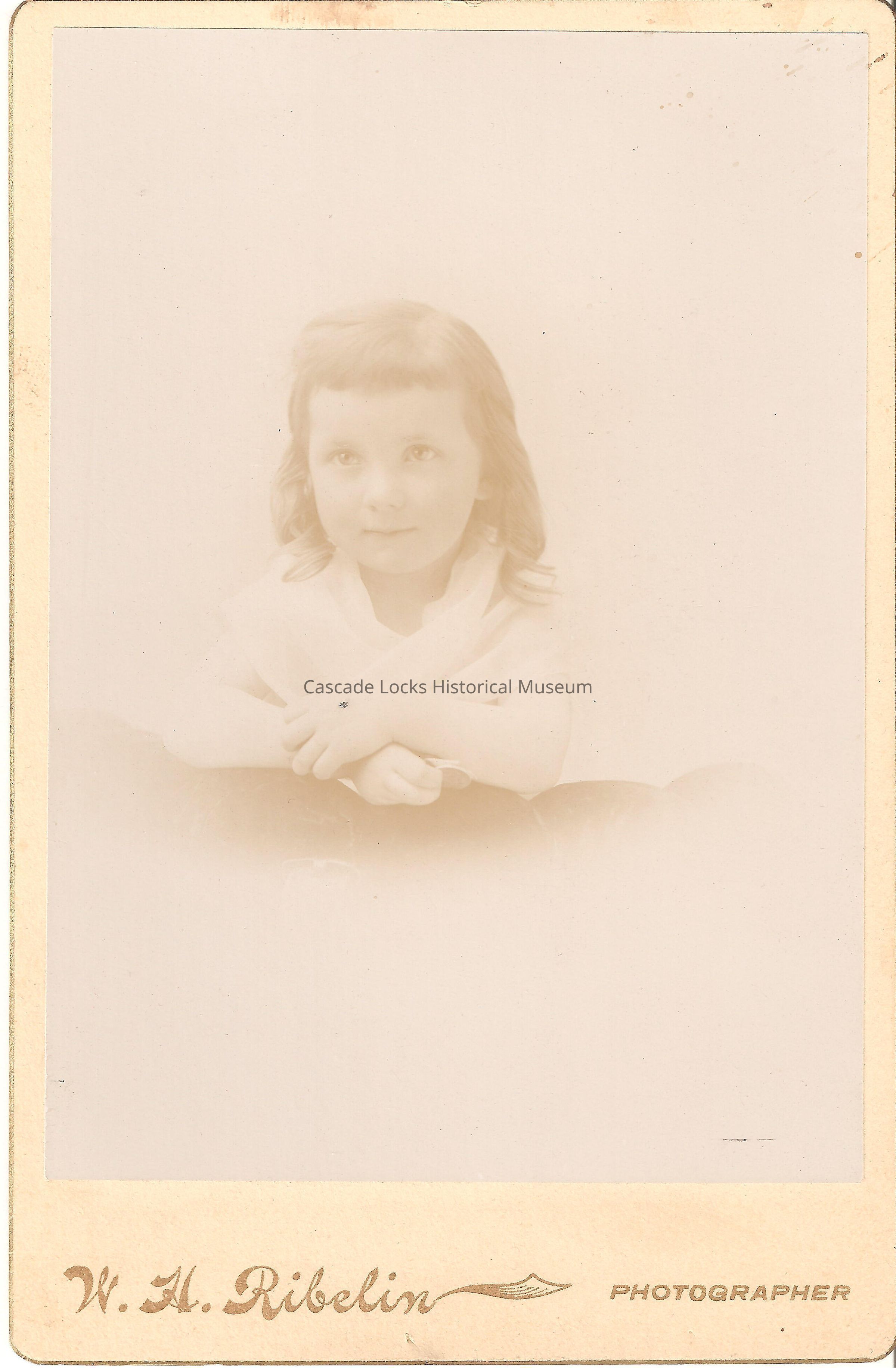Photo portrait of a young girl with shoulder length hair with curls wearing a white/ light lose fabric. Image is in black and white. Image is on off-white cabinet card with gold font and edge. Card reads: W. H. Ribelin Photographer. Previously located in photo album 2020.1.19 photo slot 26.