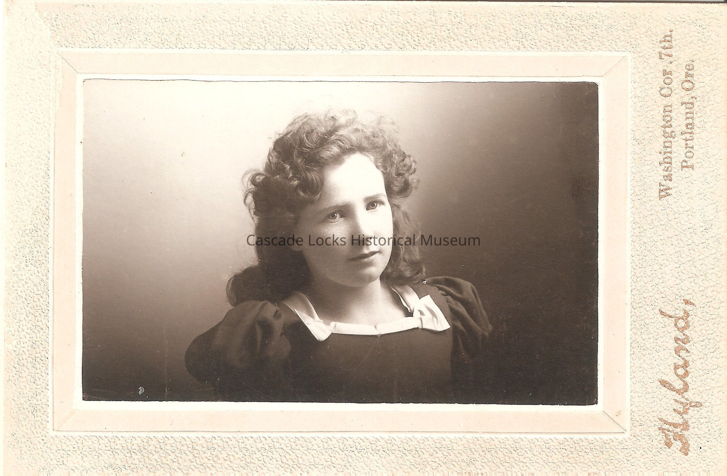 Photo portrait of a young woman in a dark dress with a square neckline and light colored accent. Image is in black and white. Girl has long curly hair. Image is on white textured cabinet card.