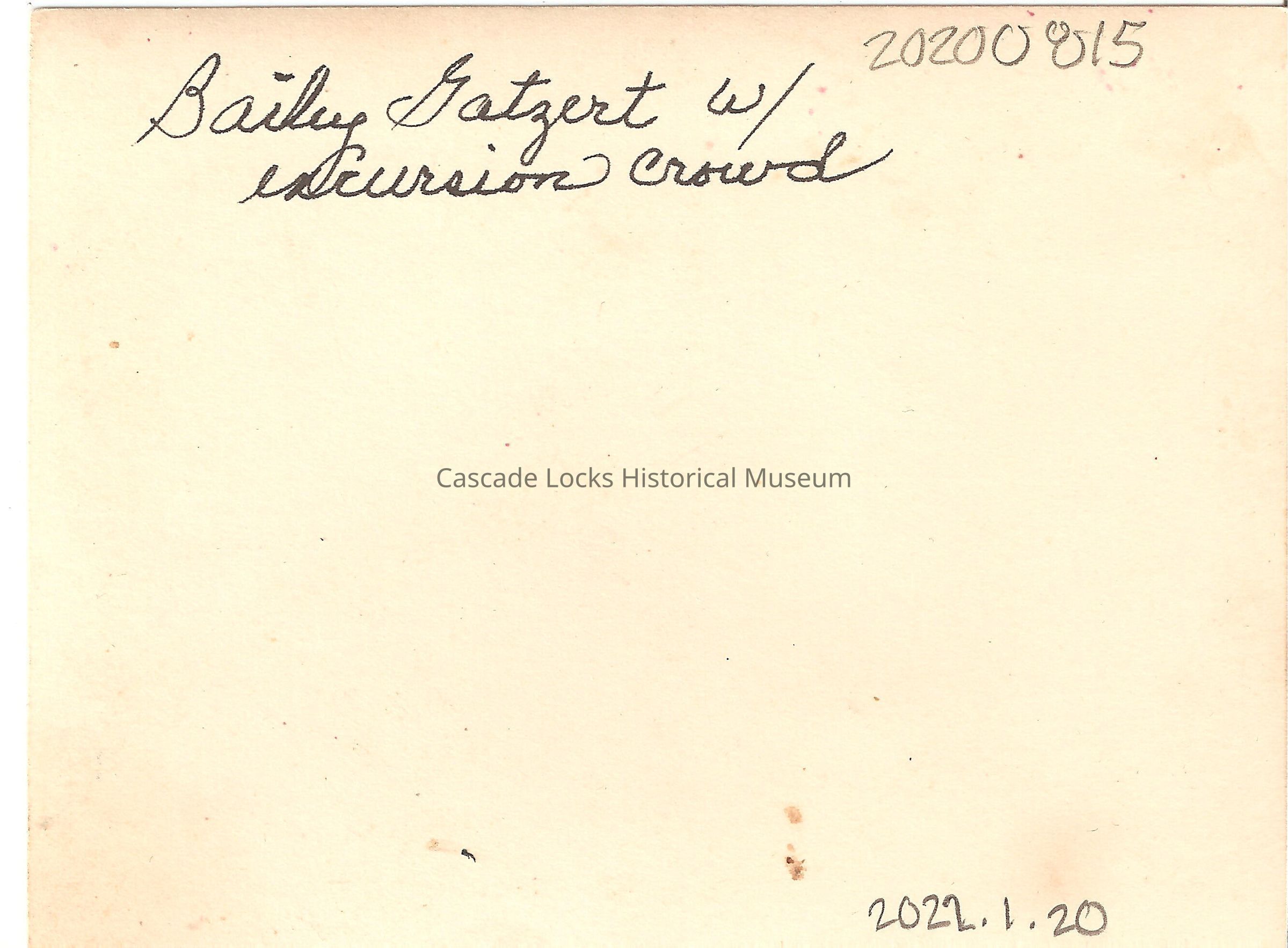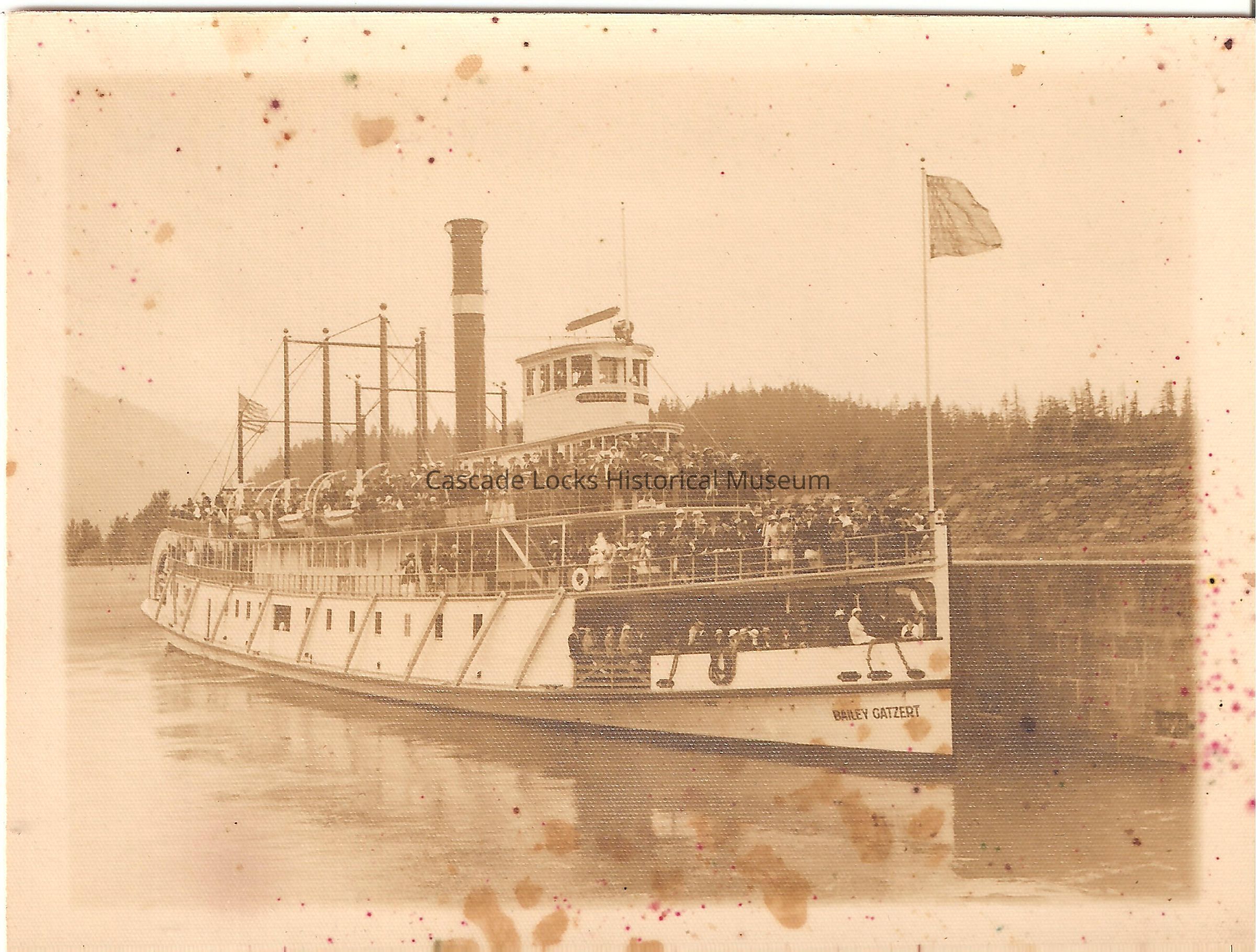 Photograph of the sternwheeler, Bailey Gatzert, in the Cascade Locks and Canal. Back of image reads; "Bailey Gatzert w/ excursion crowd"