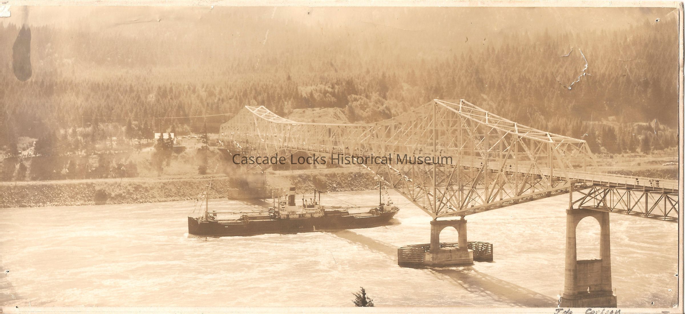 Photograph of the Bridge of the Gods looking south from the Washington bank. In the image there is a barge going under the bridge. The barge has strings of flags decorated on both ends of the barge. There is wooden structures on the base of the bridge columns that could be possibly being used as bumpers.